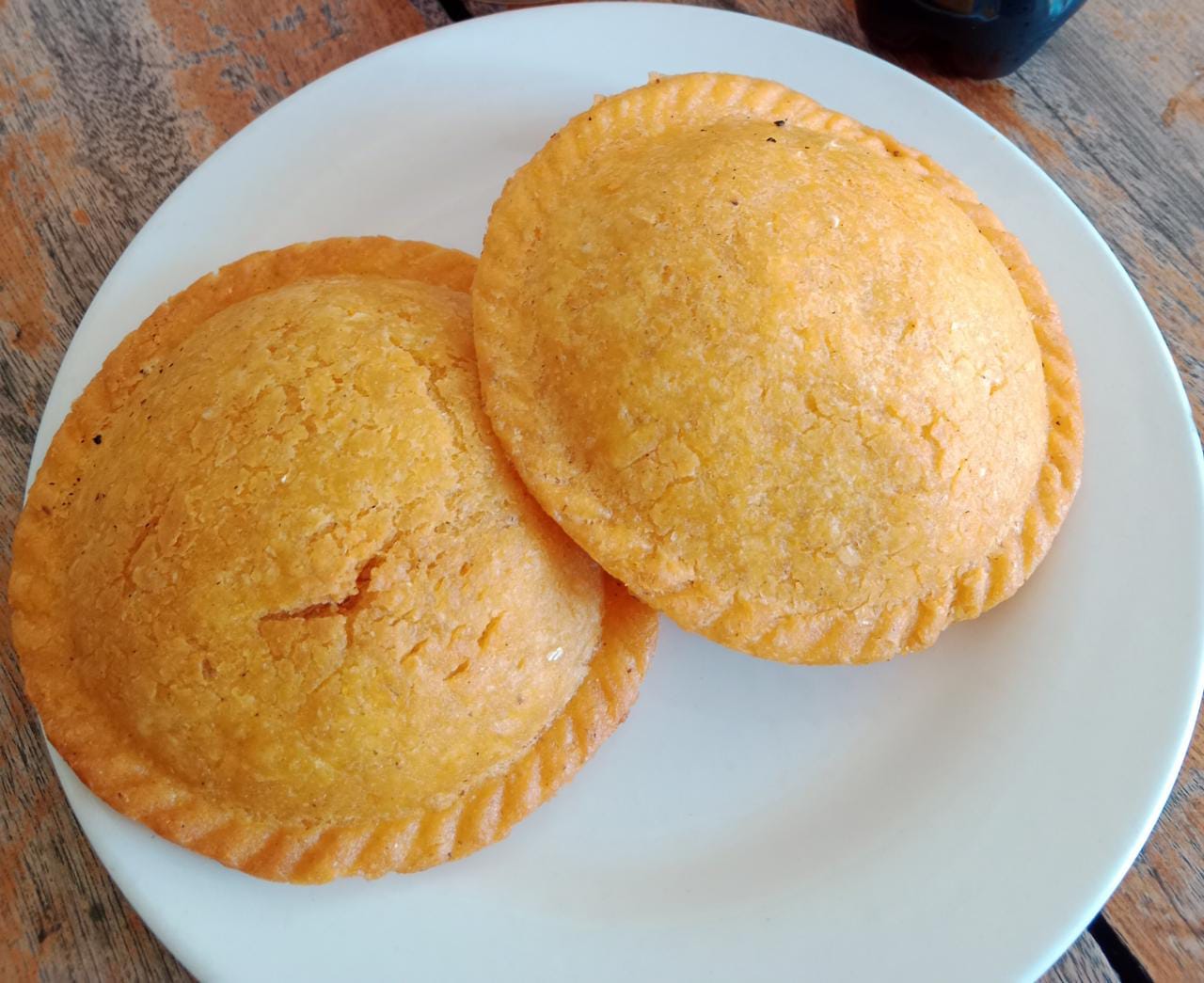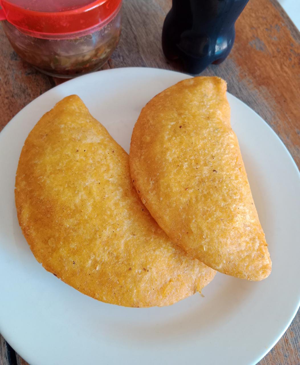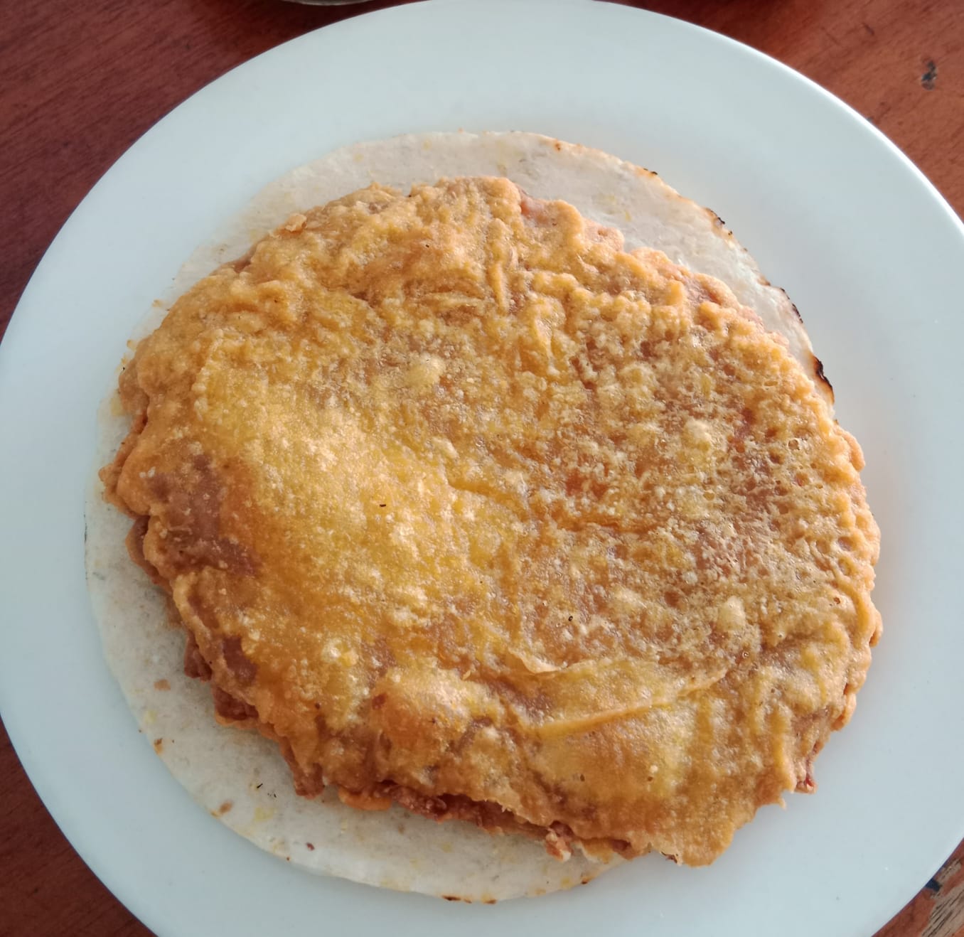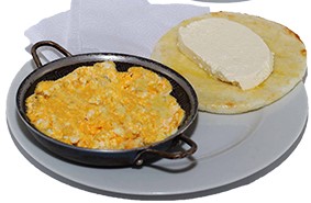 Calentado con carne, frijoles, arroz, huevo y arepa con quesito.