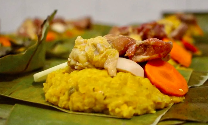Arroz, pollo, cerdo tocino, huevo cocido, papas y zanahoria en rodajas.