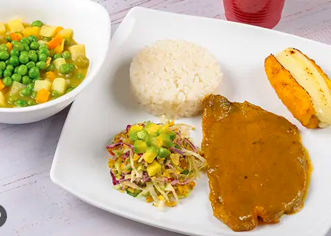 Acompañada de papas a la francesa, tajada de maduro, y ensalada.