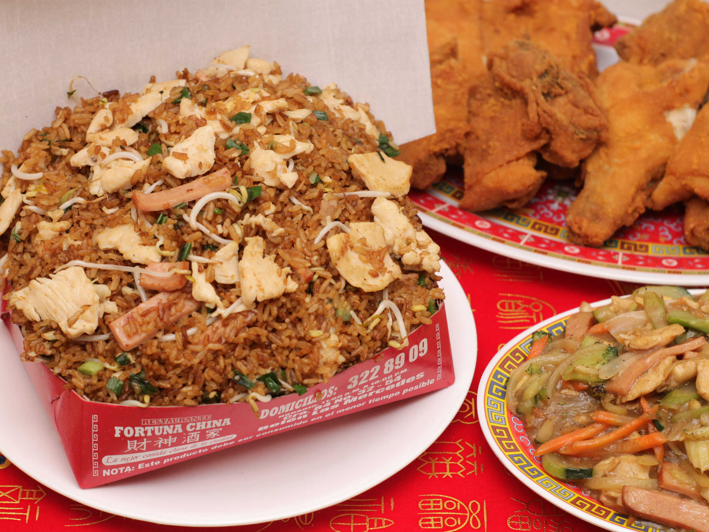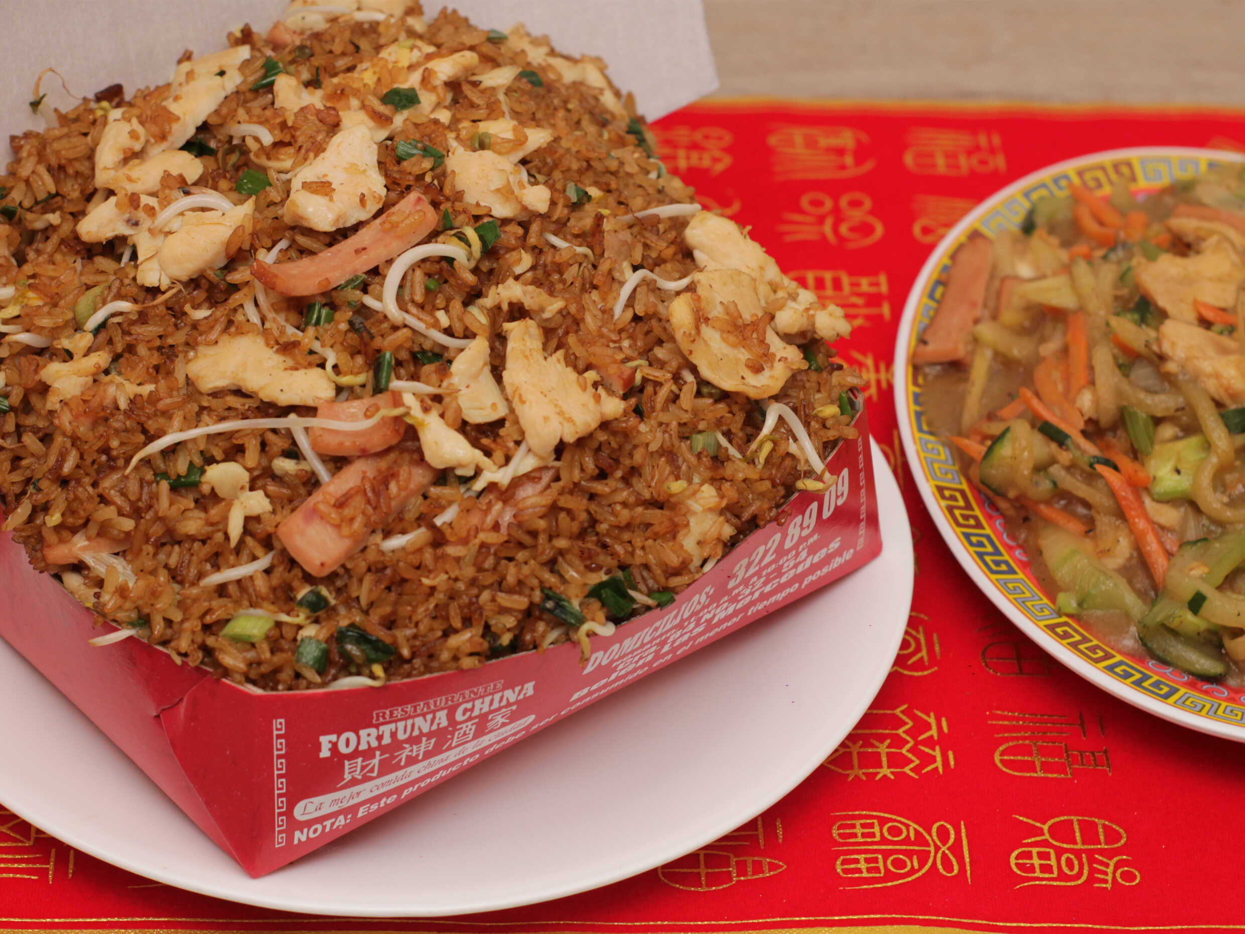 Arroz, pollo, cerdo, jamón y raices chinas aconpañado con spaguetis y pollo y jamón.