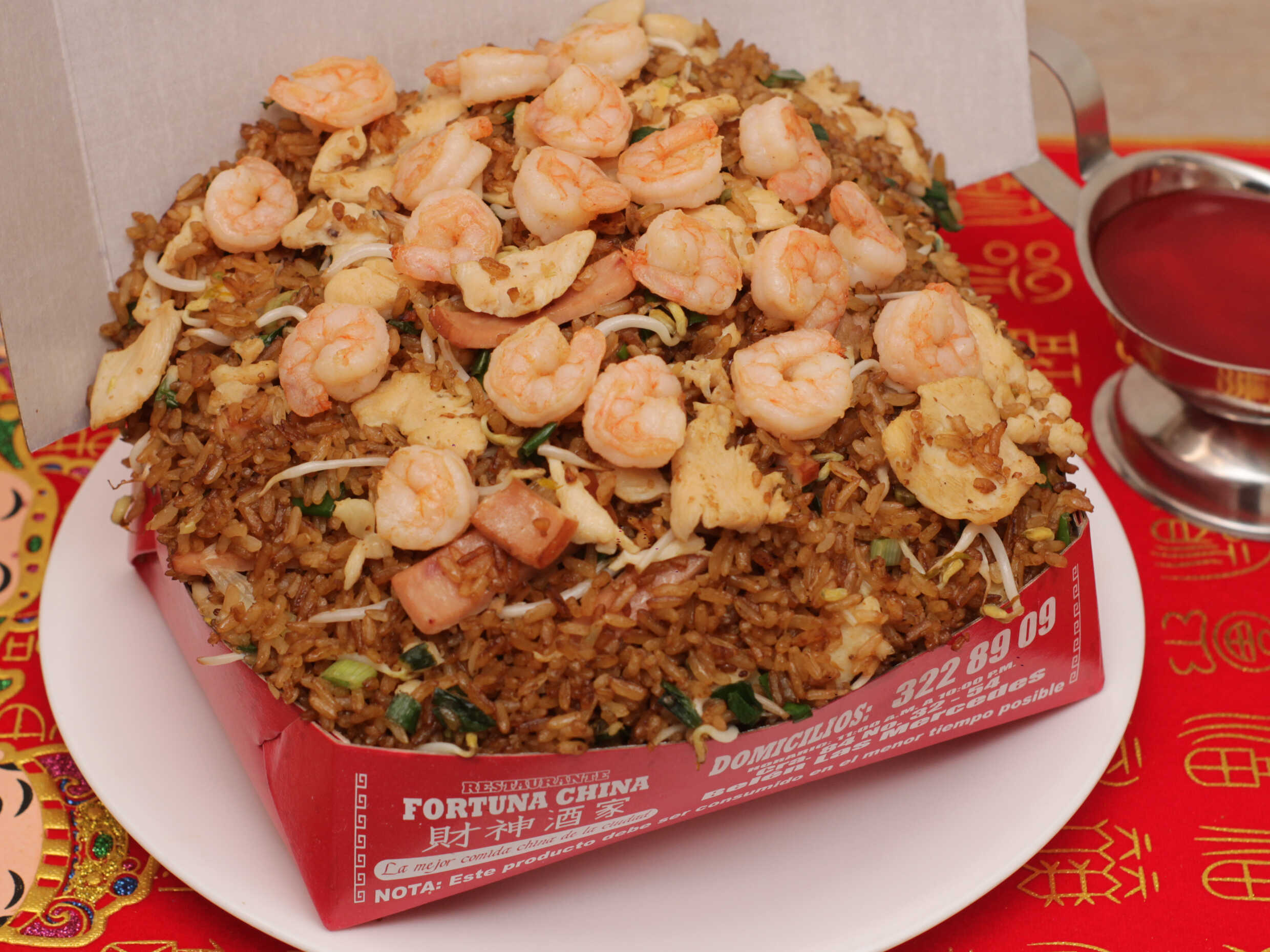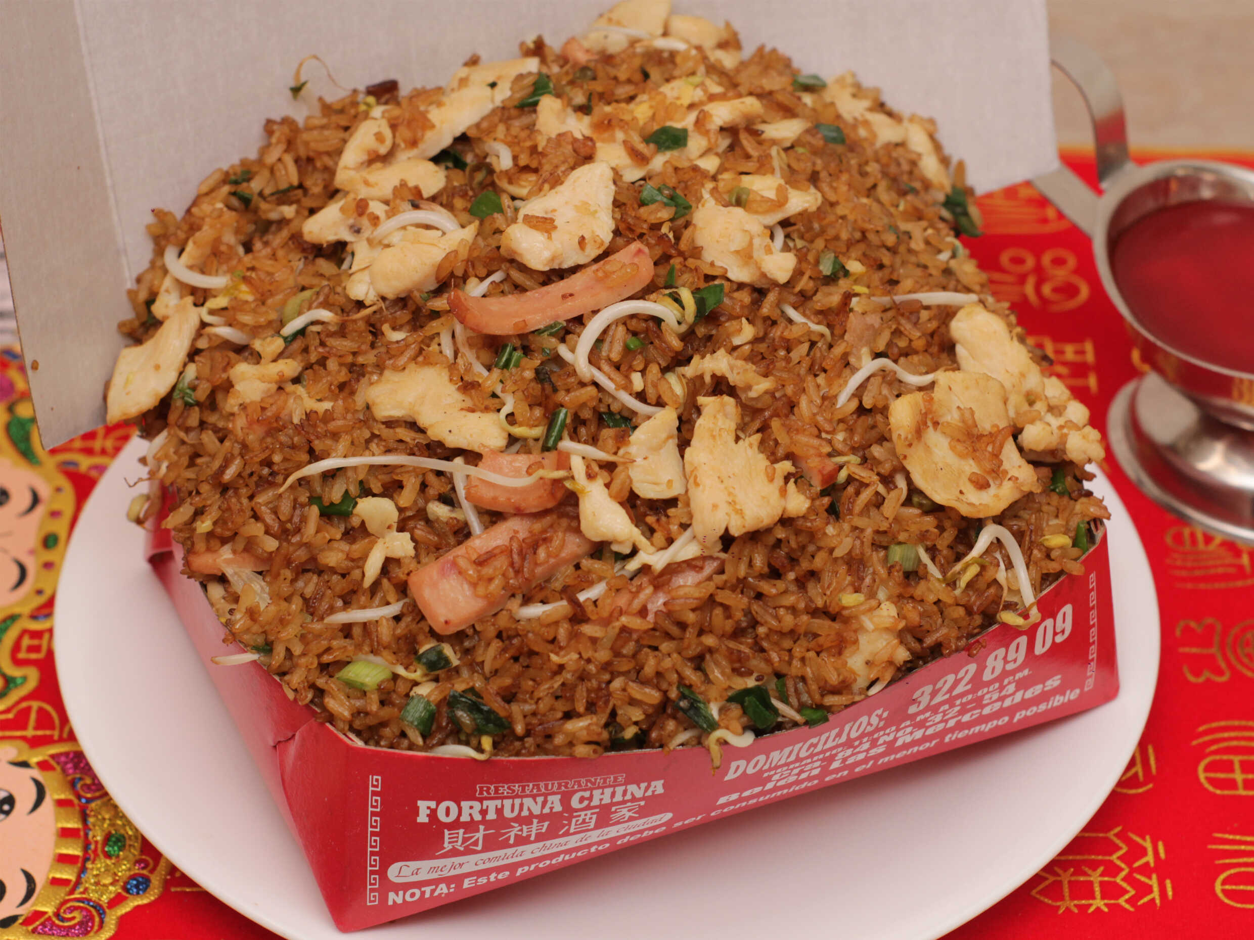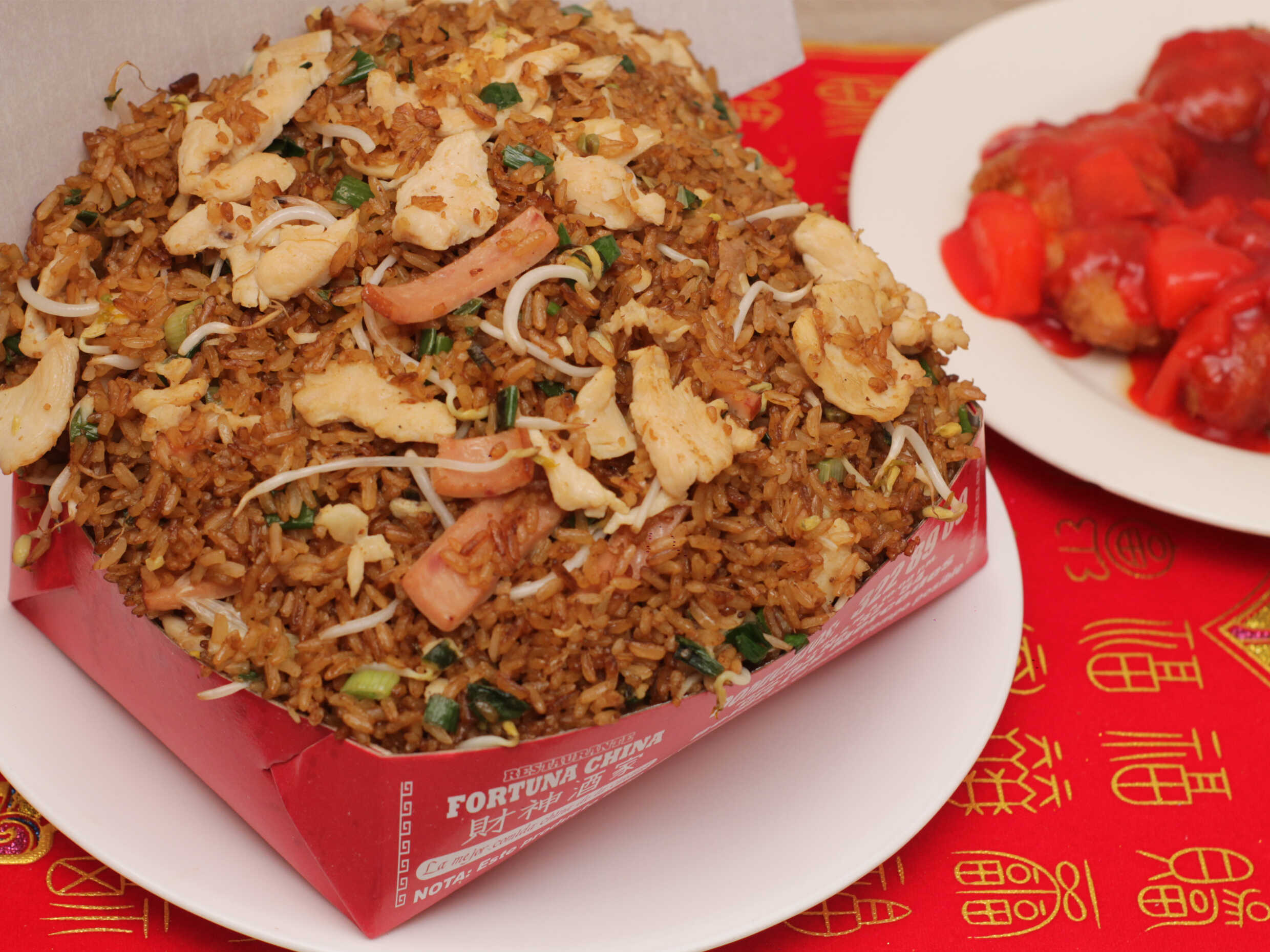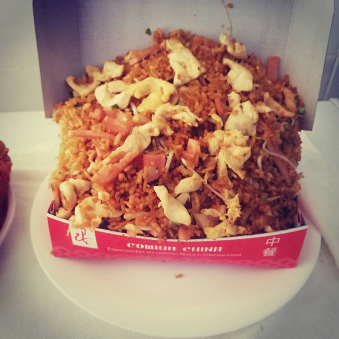 Arroz chino con trozos de pollo, jamón, camarones y raíces chinas, acompañado de salsa agridulce. (Para máx. 2 personas)