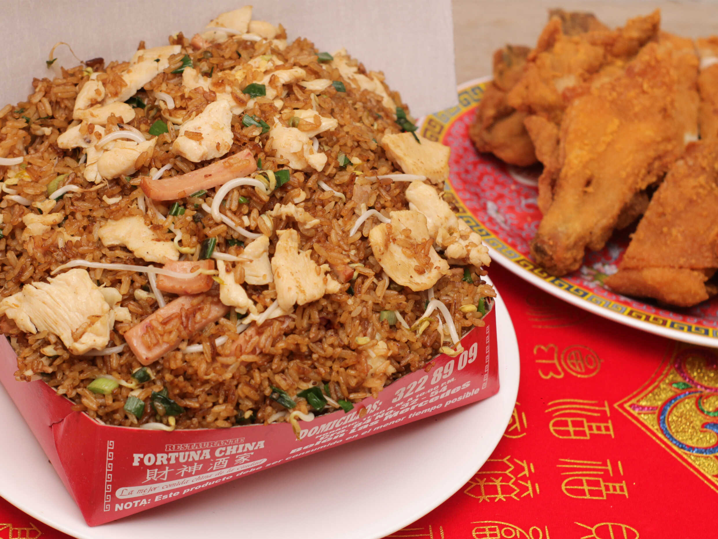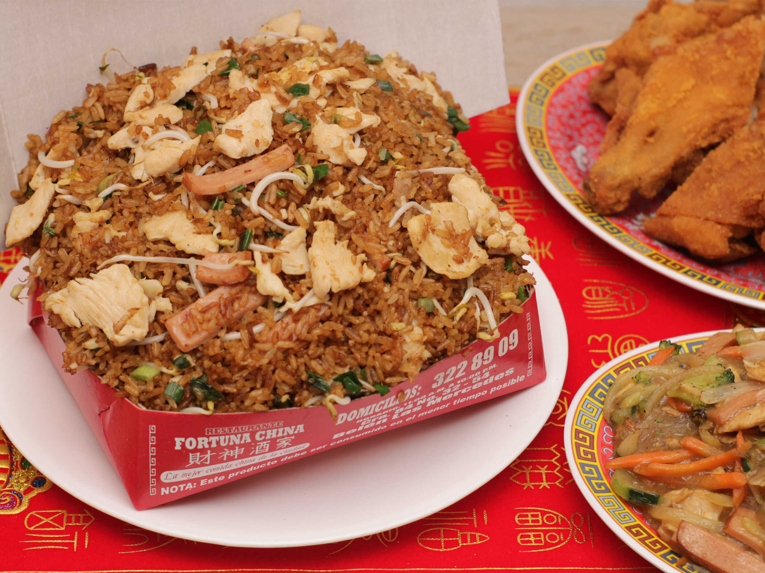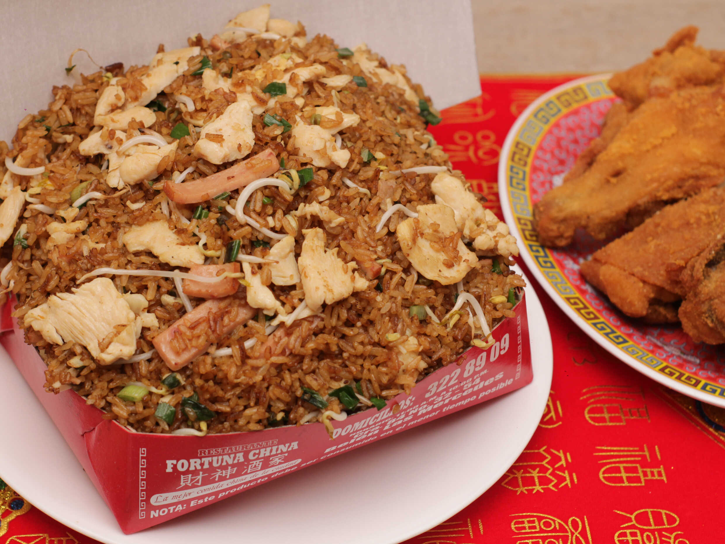 Arroz chino con trozos de pollo, jamón, camarones y raíces chinas, acompañado de salsa agridulce. (Para máx. 2 personas)