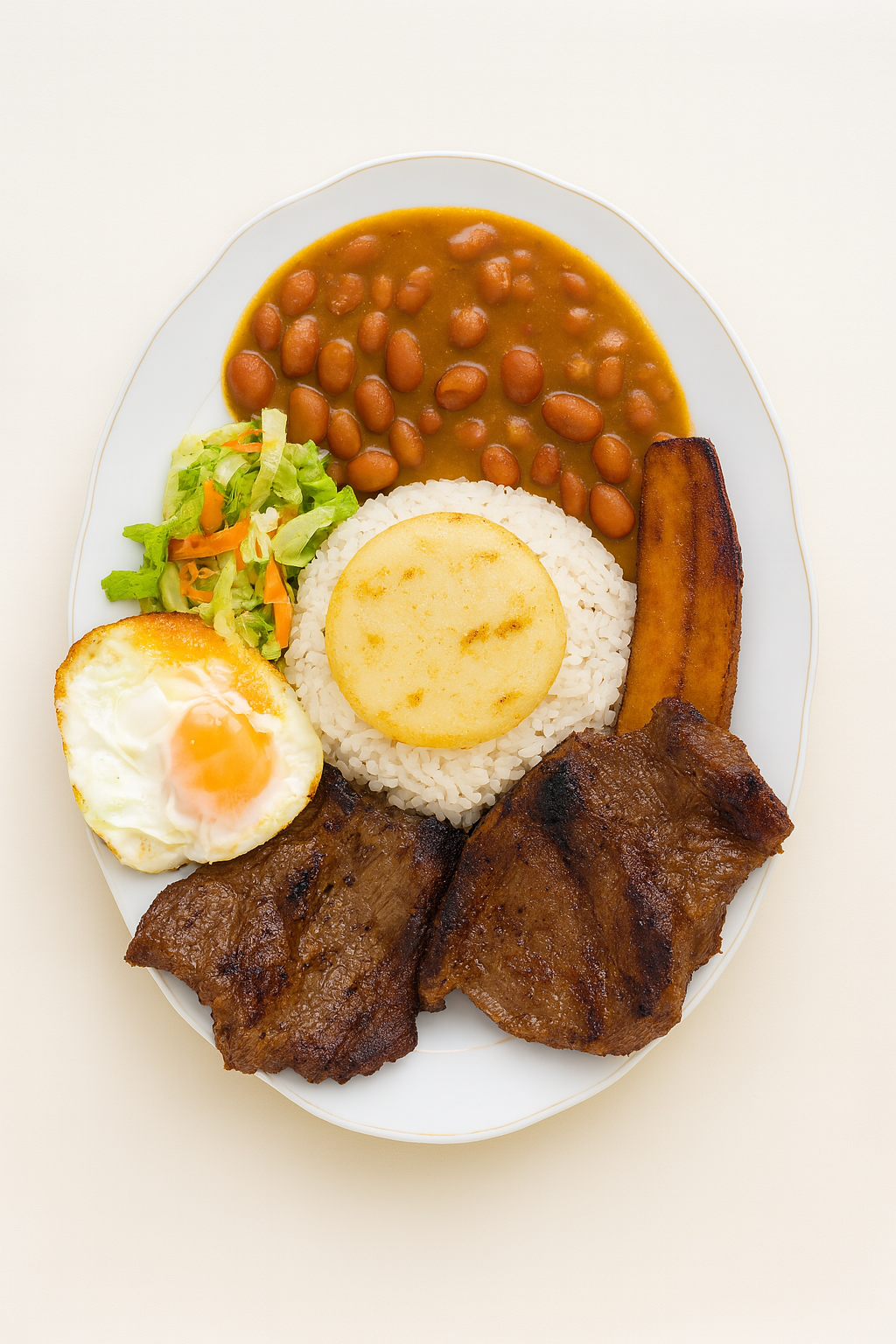 Porcion personal: Tradicional bandeja paisa con arroz blanco, arepa asada, frijoles rojos en salsa, plátano maduro frito, ensalada fresca, lechuga, tomate, zanahoria.y jugosa carne asada a la parrilla, con sopa y bebida