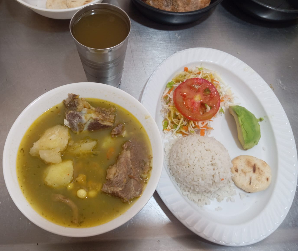 Delicioso plato colombiano con albondigas, acompañada de yuca, papa amarilla, arroz blanco, arepa asada, frijoles rojos y ensalada fresca, lechuga, tomate, zanahoria, sopa y bebida