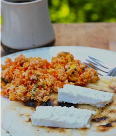 Arepa con mantequilla, queso, huevos fritos, chocolate o café.