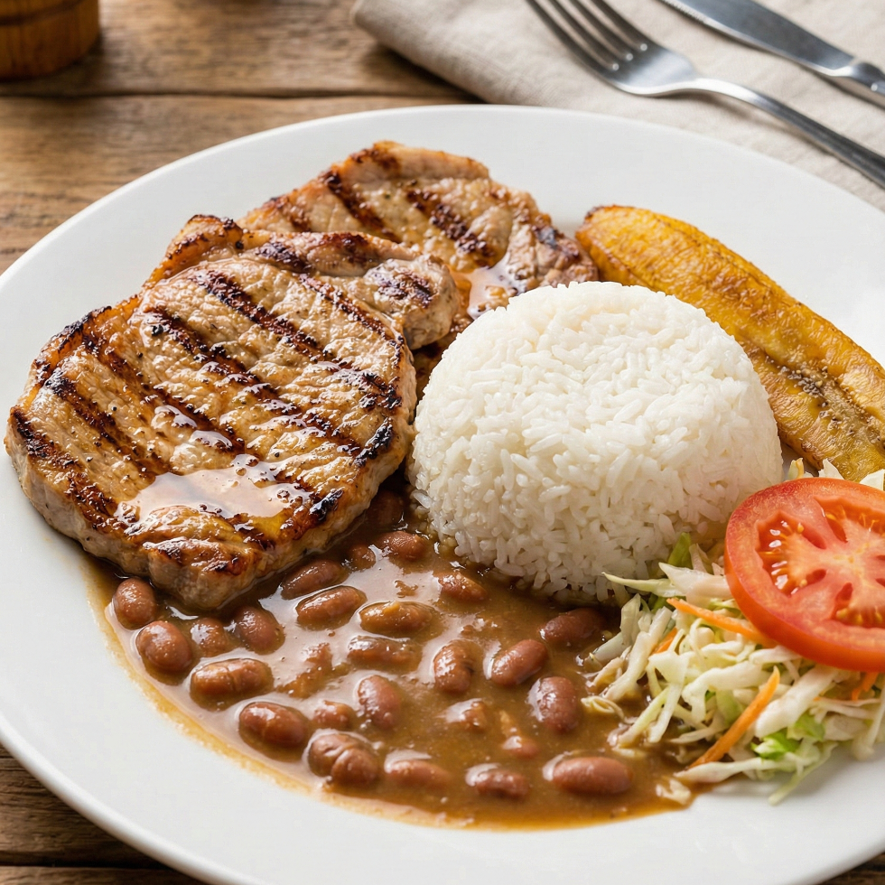 Proteina a Eleccion, Arroz blanco, Ensalada de la casa, frijoles, papas o maduro, bebida