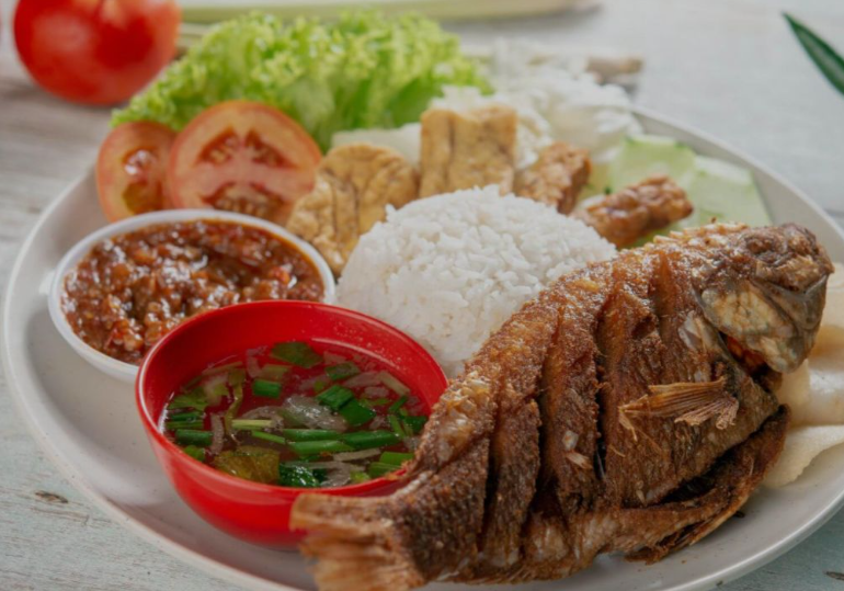 Tilapia acompañada de arroz, patacón, ensalada y guacamole.