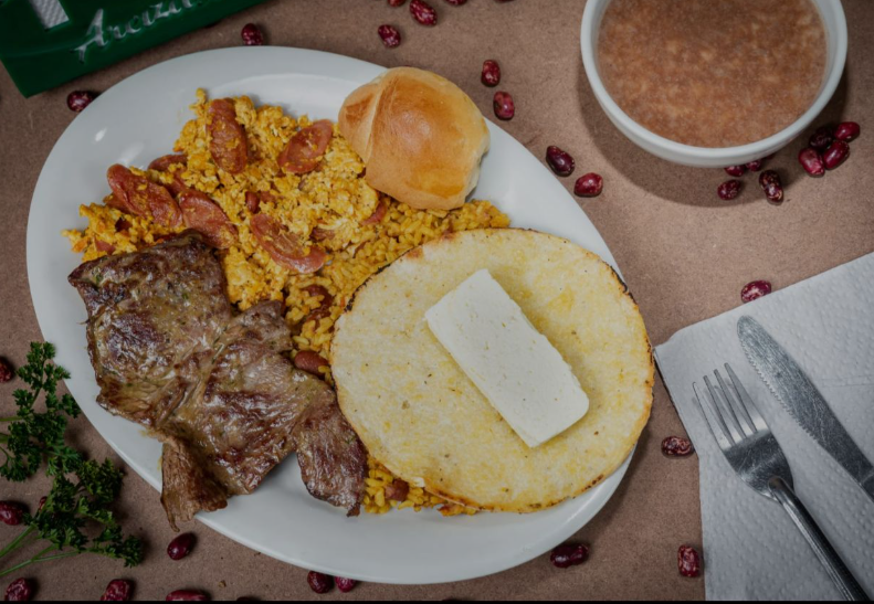 Arepa con mantequilla, carne de cerdo, huevos fritos, calentado de frijoles, acompañados de chocolate o café.