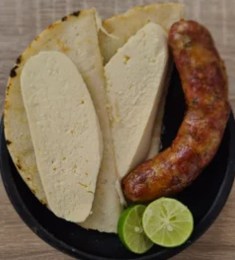 Arepa con mantequilla, queso, huevos fritos, acompañados de salchicha Ranchera, chocolate o café.