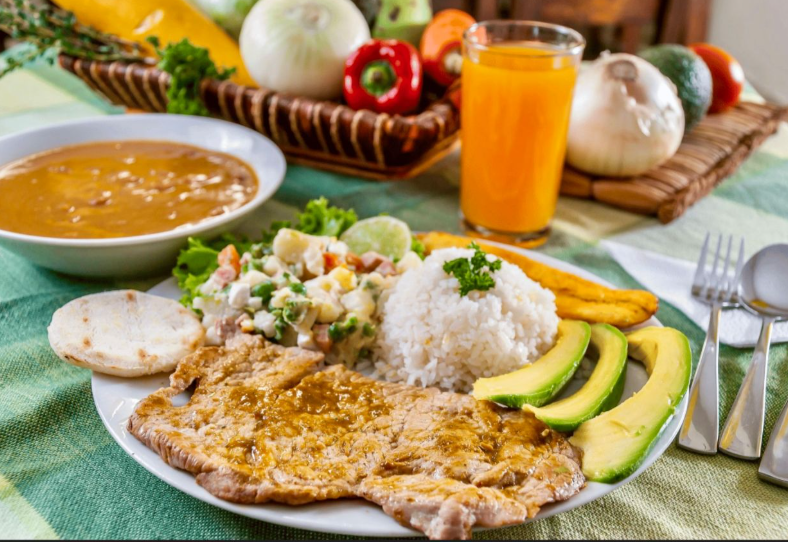 Sopa del día, arroz, tajada de maduro, huevo, ensalada de la casa, jugo del día.