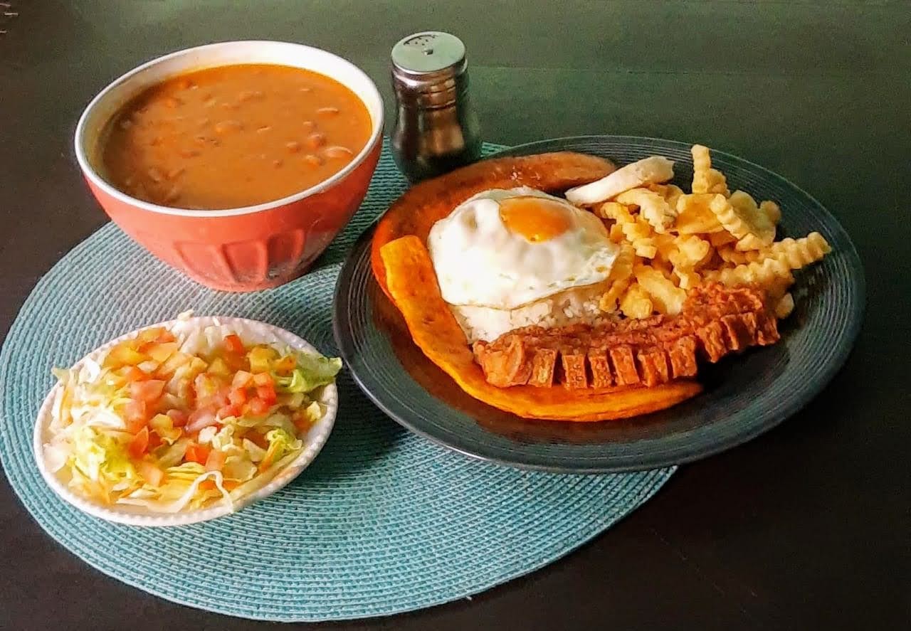 Acompañada de proteina CHICHARRON frijoles paisas, huevo, arroz , papas a la francesa, tajada de maduro y ensalada.