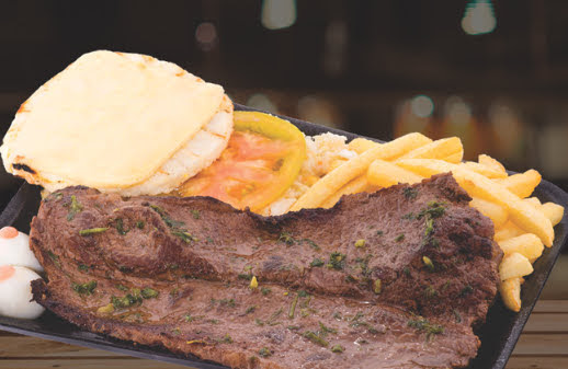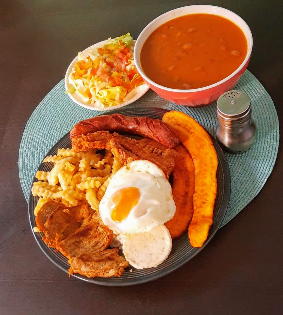 Acompañada de Frijoles paisas Carne asada Chicharrón Chorizo de cerdo Arroz Huevo Papa francesa Tajada de maduro Ensalada