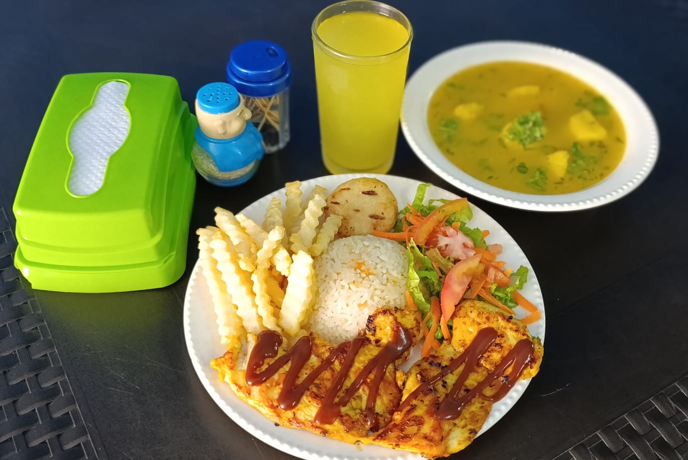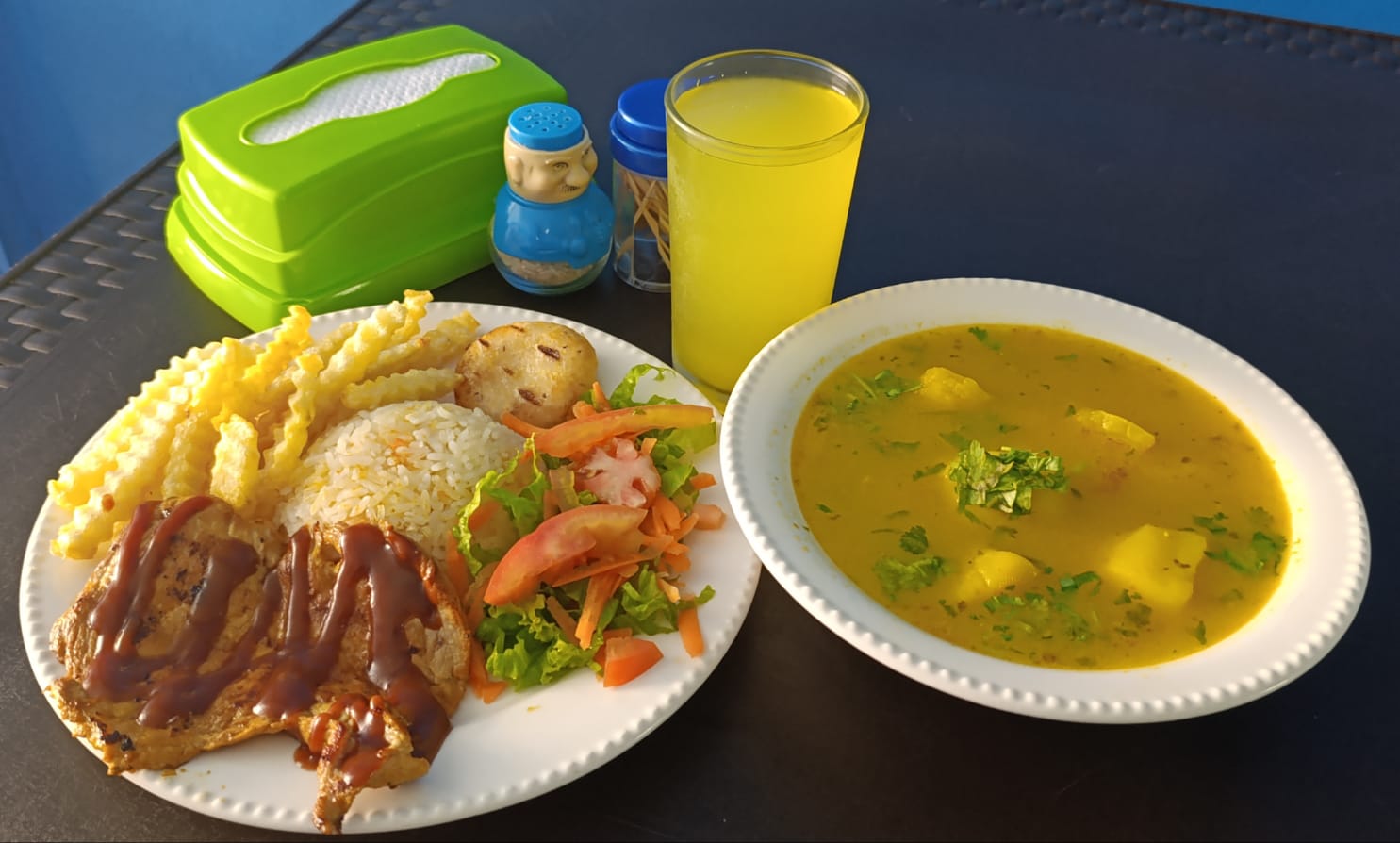 Proteína pollo a la plancha, arroz , ensalada de lechuga y zanahoria , papa francesa y sopa del día