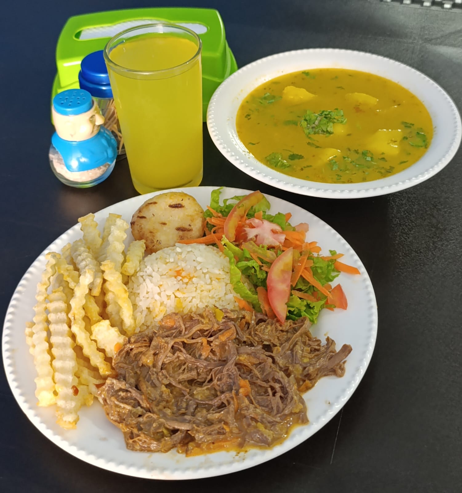 Proteína carne desmechada ,arroz ,papa francesa, ensalada, y sopa del día