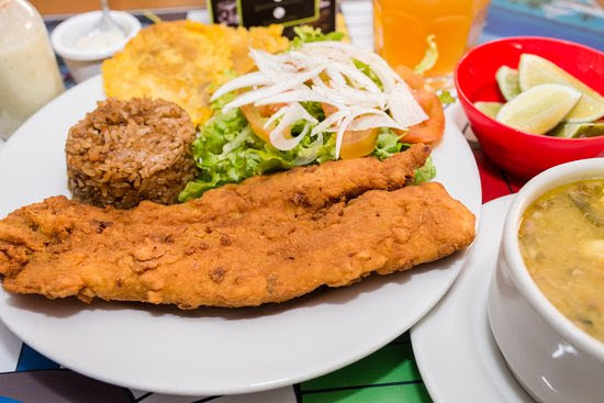 Acompañado de arroz con coco, patacón , ensalada y consomé de pescado