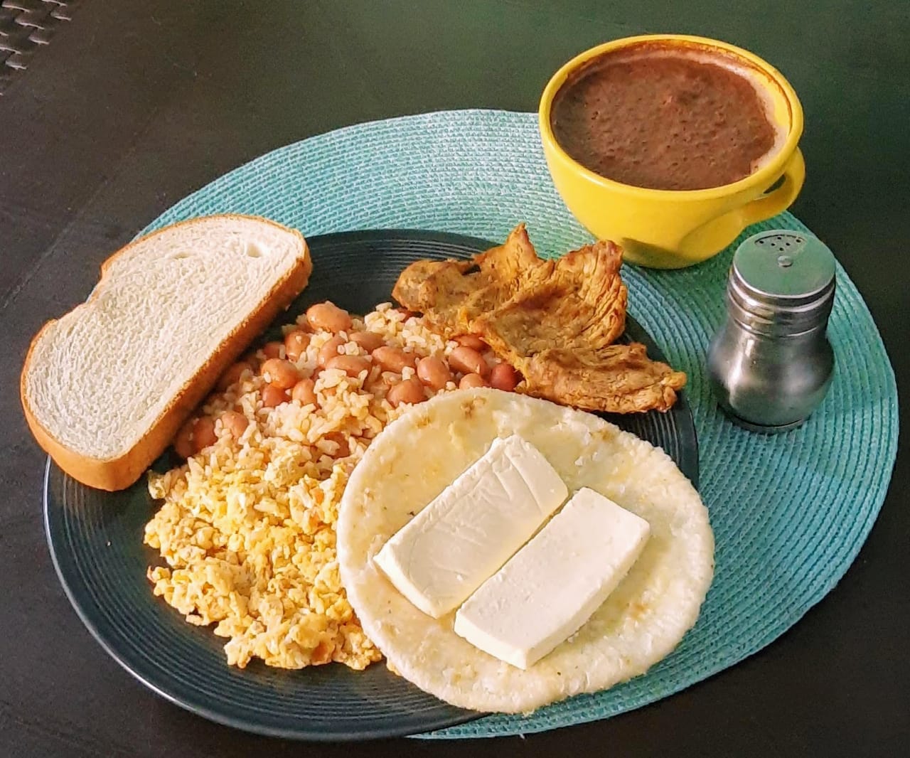 Calentado de frijol con arroz , Proteína Carne de cerdo , Huevos pericos con hogao , Arepa con mantequilla ,Quesito , Pan y Bebida Chocolate
