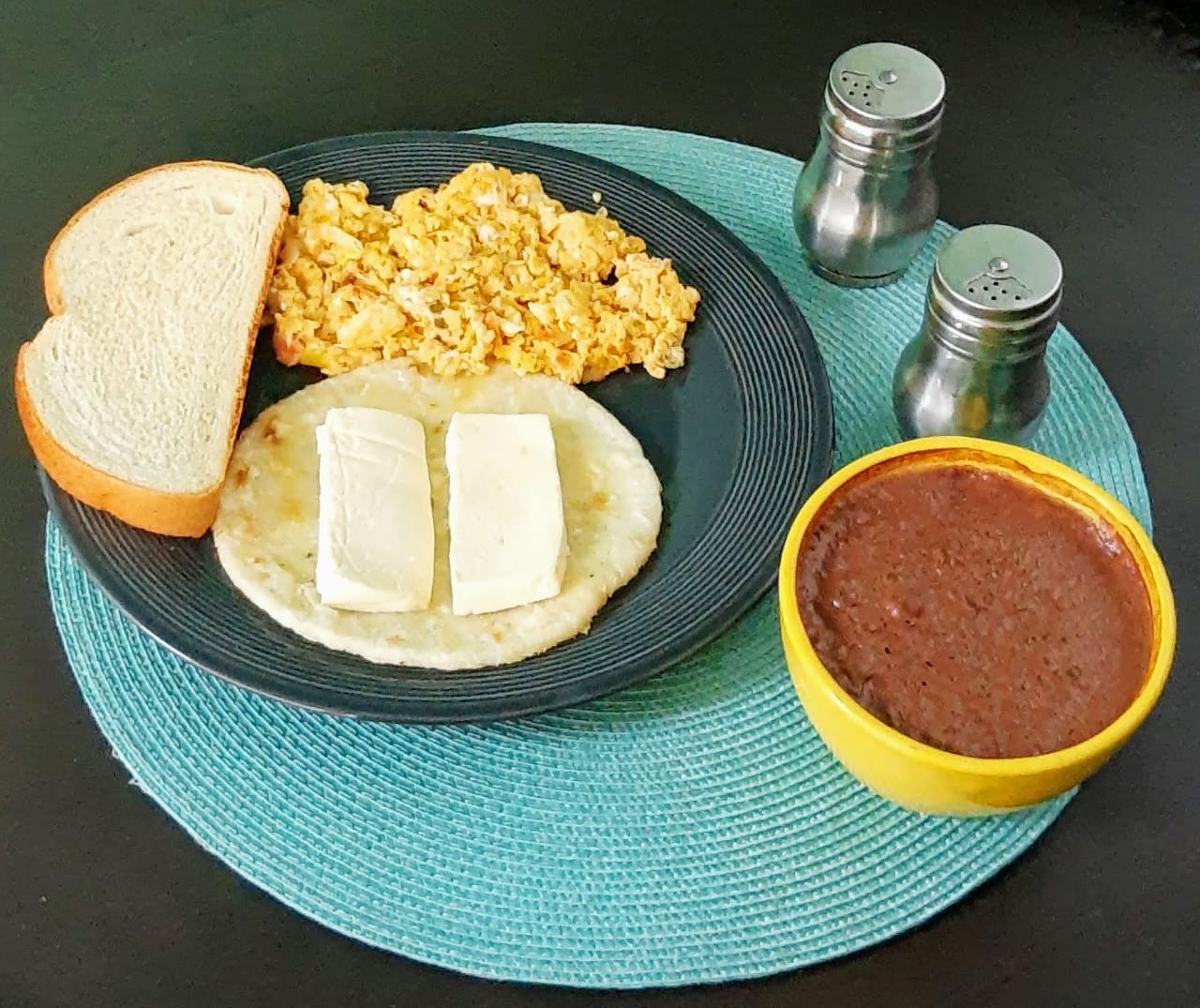 Huevos pericos con arepa, quesito, pan y chocolate .