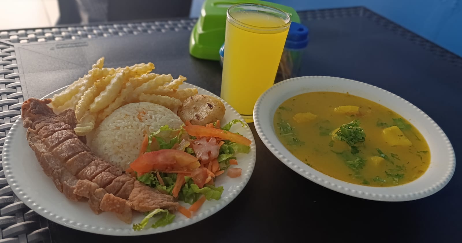 Proteína Chicharrón ,arroz , ensalada, papa francesa y sopa del día