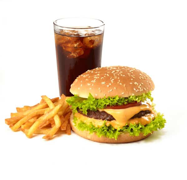 Hamburguesa con : carne de hamburguesa + tocineta + queso mozarella+ cebolla + tomate + gaseosa 250ml