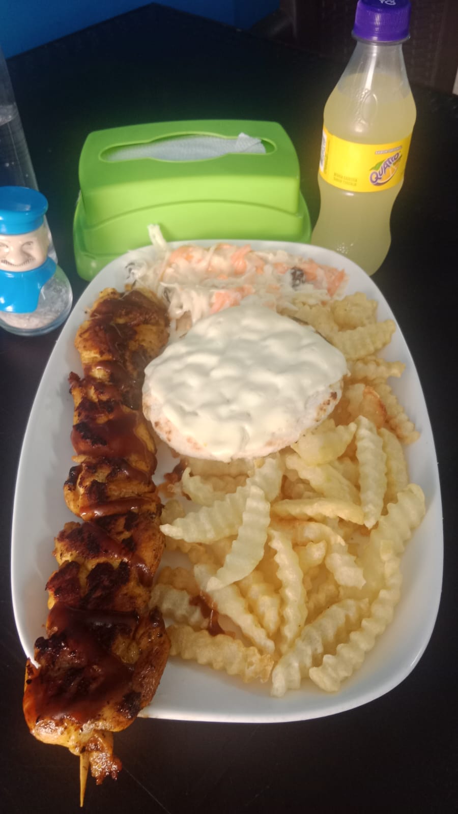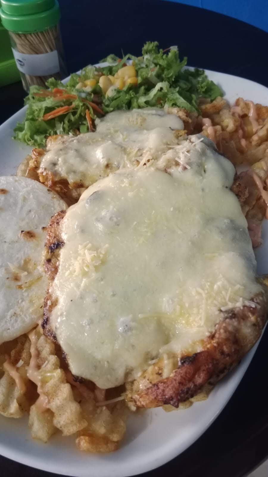 pollo a la plancha con bbq papas a la francesa, ensalada y arepa con queso mozarella