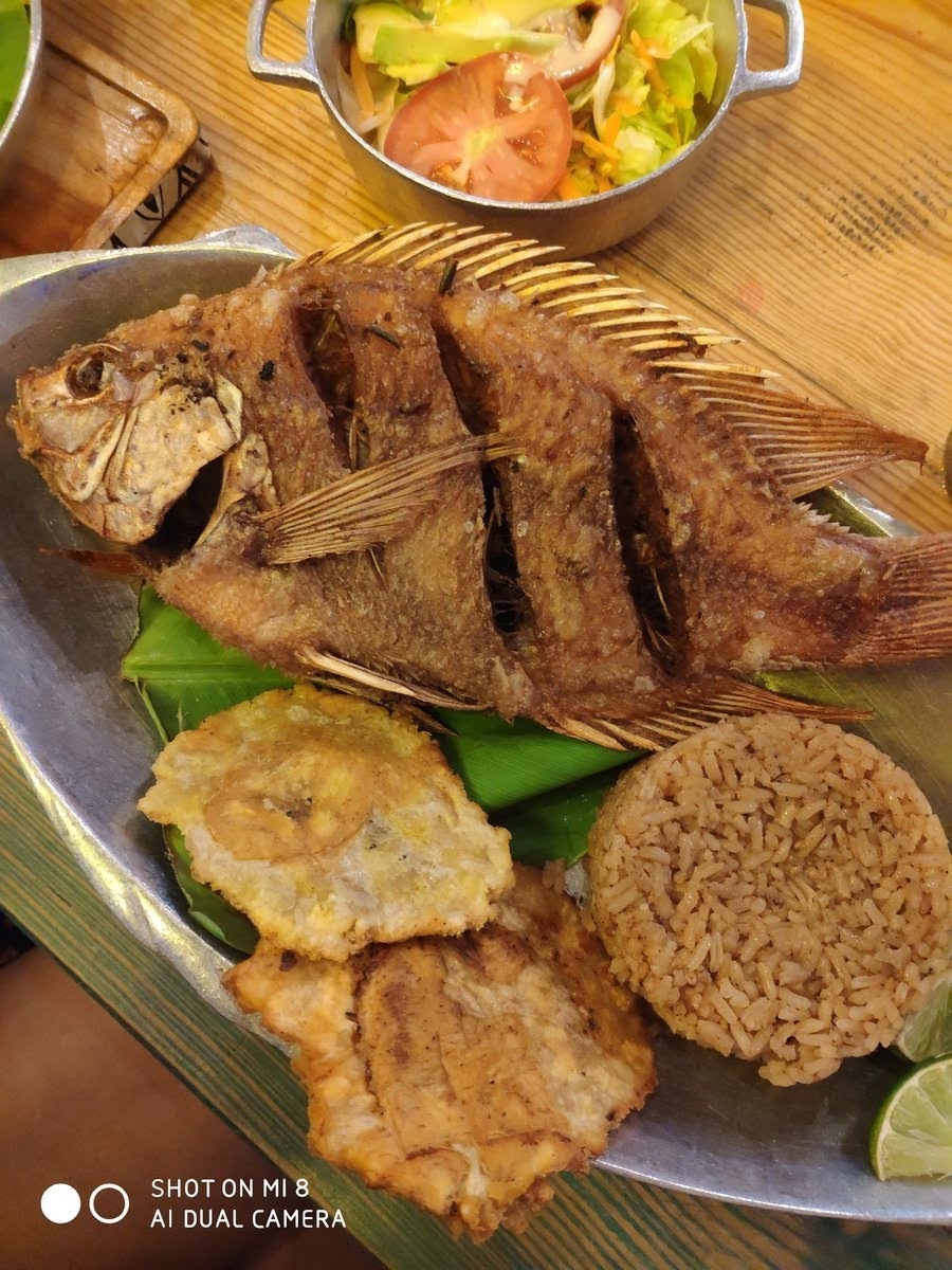 Acompañado de Arroz con coco Patacón Ensalada Consomé de pescado