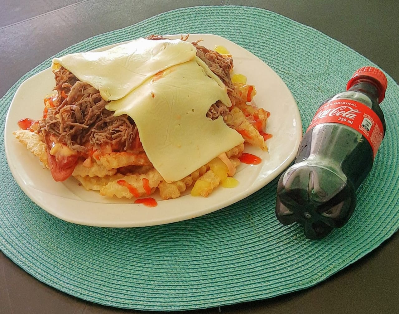 Acompañada de Salchicha , Papa francesa , Carne desmechada , Queso mozzarella y Gaseosa mini