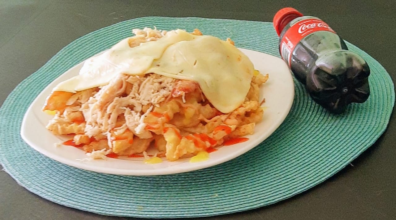 Acompañado de Pollo desmechado , Queso mozzarella y Gaseosa mini