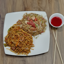 250gr de arroz especial (con trocitos de pollo, jamón y cerdo) y 250gr de lomein especial (pastas salteadas con pollo, jamón y cerdo) y agua saborizada 280ml