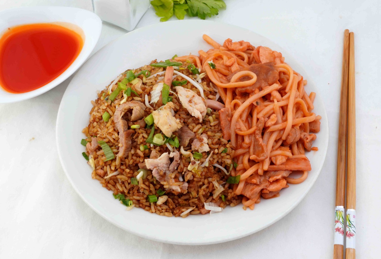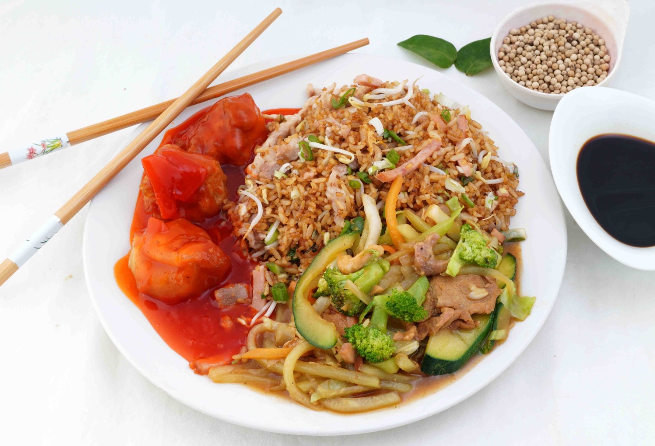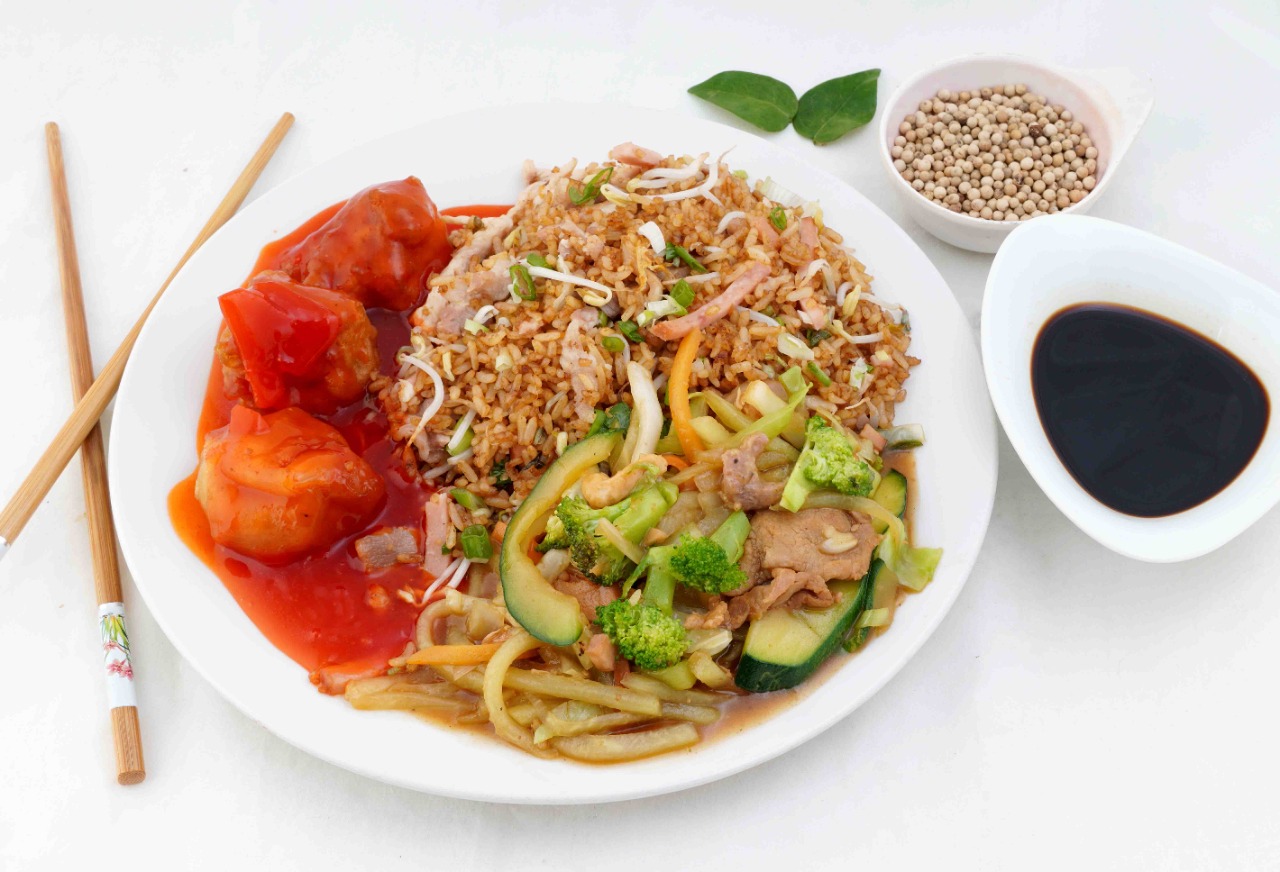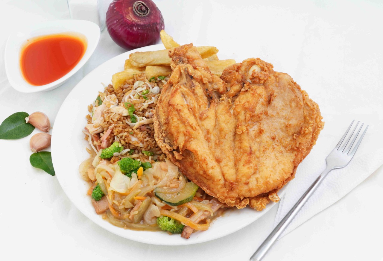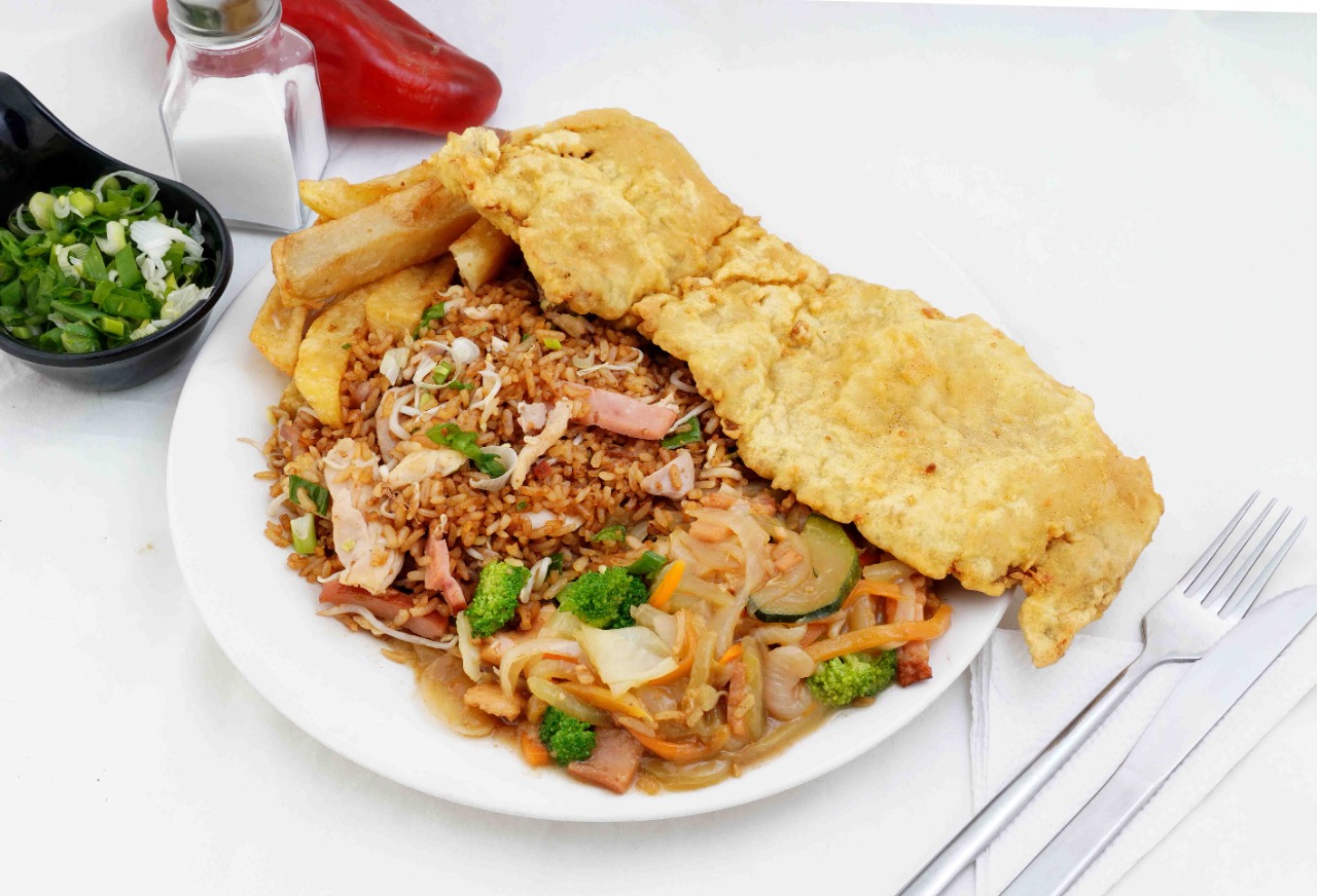 Arroz Chino + Chop Suey + Papas + Proteina a eleccion (Robalo,Pollo,Tilapia,Costilla,Chuleta)