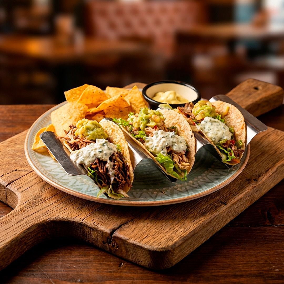 3 tacos, 1 pollo 1 carne 1 mixto, con queso, guacamole, sour cream, pico de gallo, lechuga y nachos
