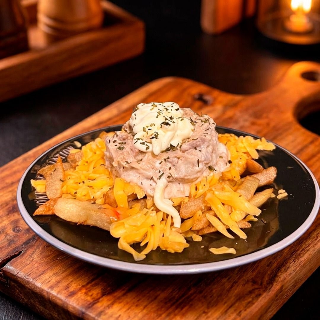 Papas, queso,sour cream, queso holandés, con una deliciosa carne de cerdo