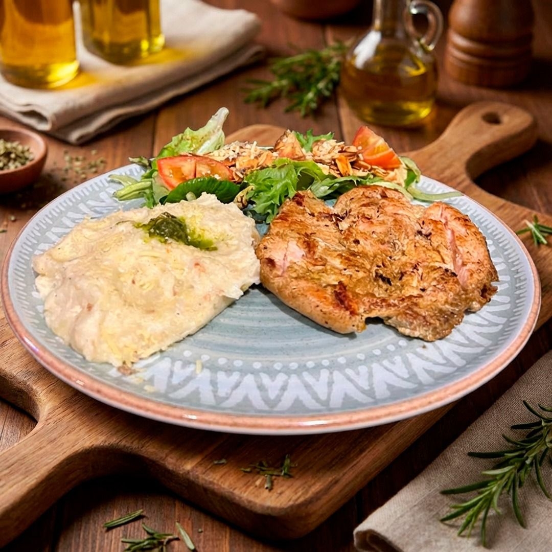 pechuga acompañado de pure de papá, patacon, ensalada