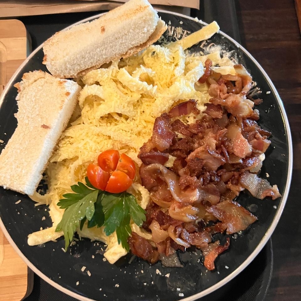 Pastas, tocineta, queso rayado, queso parmesano, pancitos