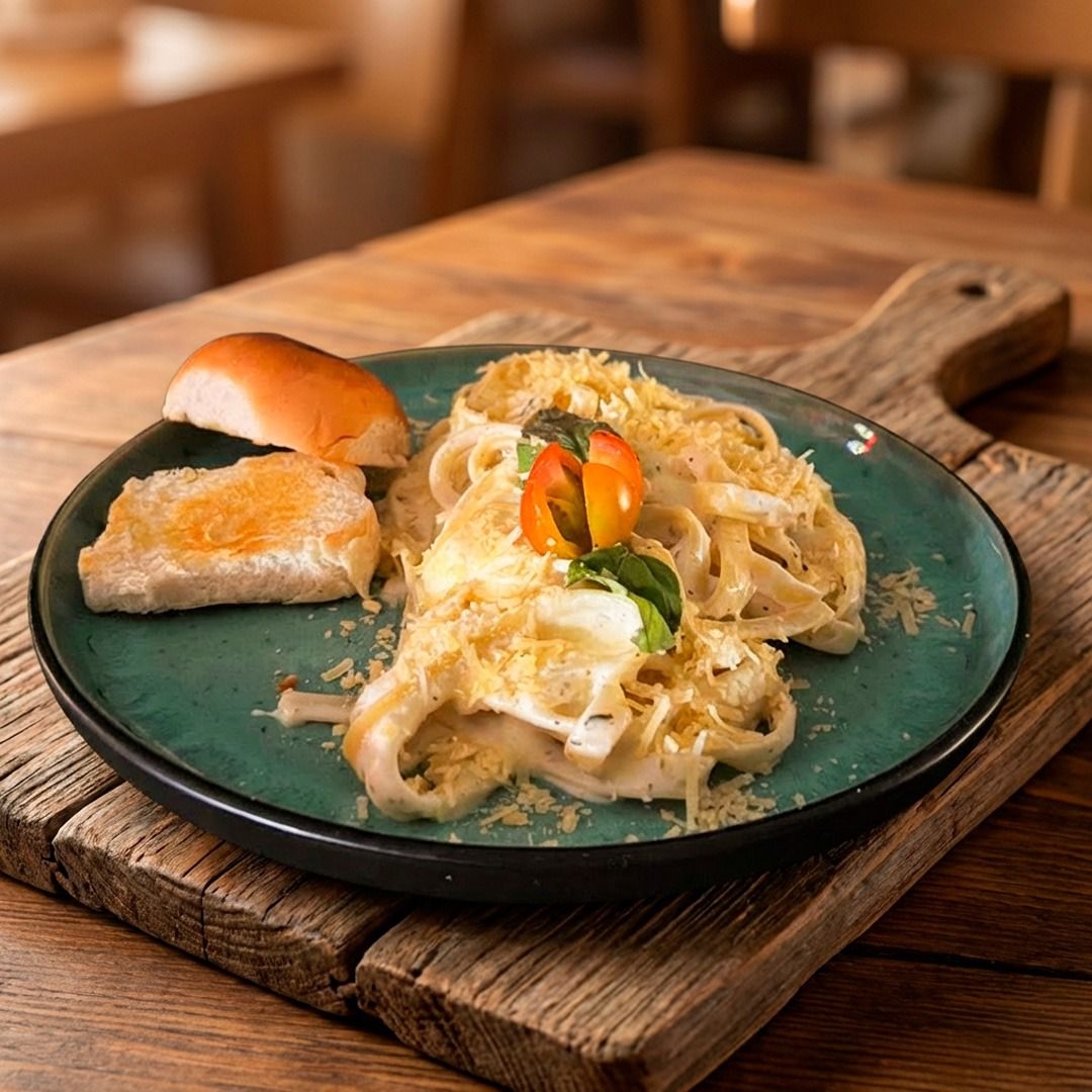 Pastas con pollo, queso parmesano, queso rayado y pancitos