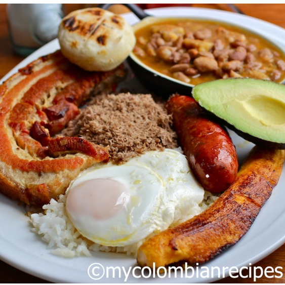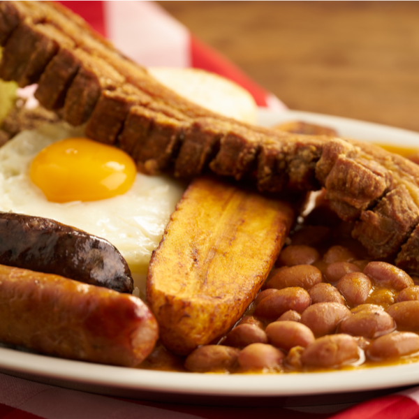 Frijol, chicharrón picado, chorizo picado, aguacate, plátano maduro picado, ripio de papa, arroz, 1 arepa y bebida de 9 oz según tu elección.