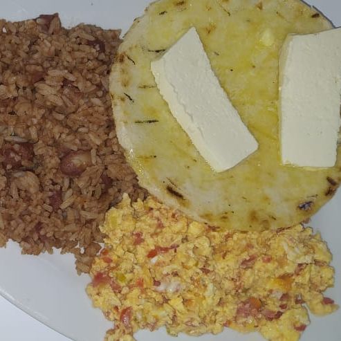 Calentado o arroz, arepa, quesito, huevos al gusto y bebida.