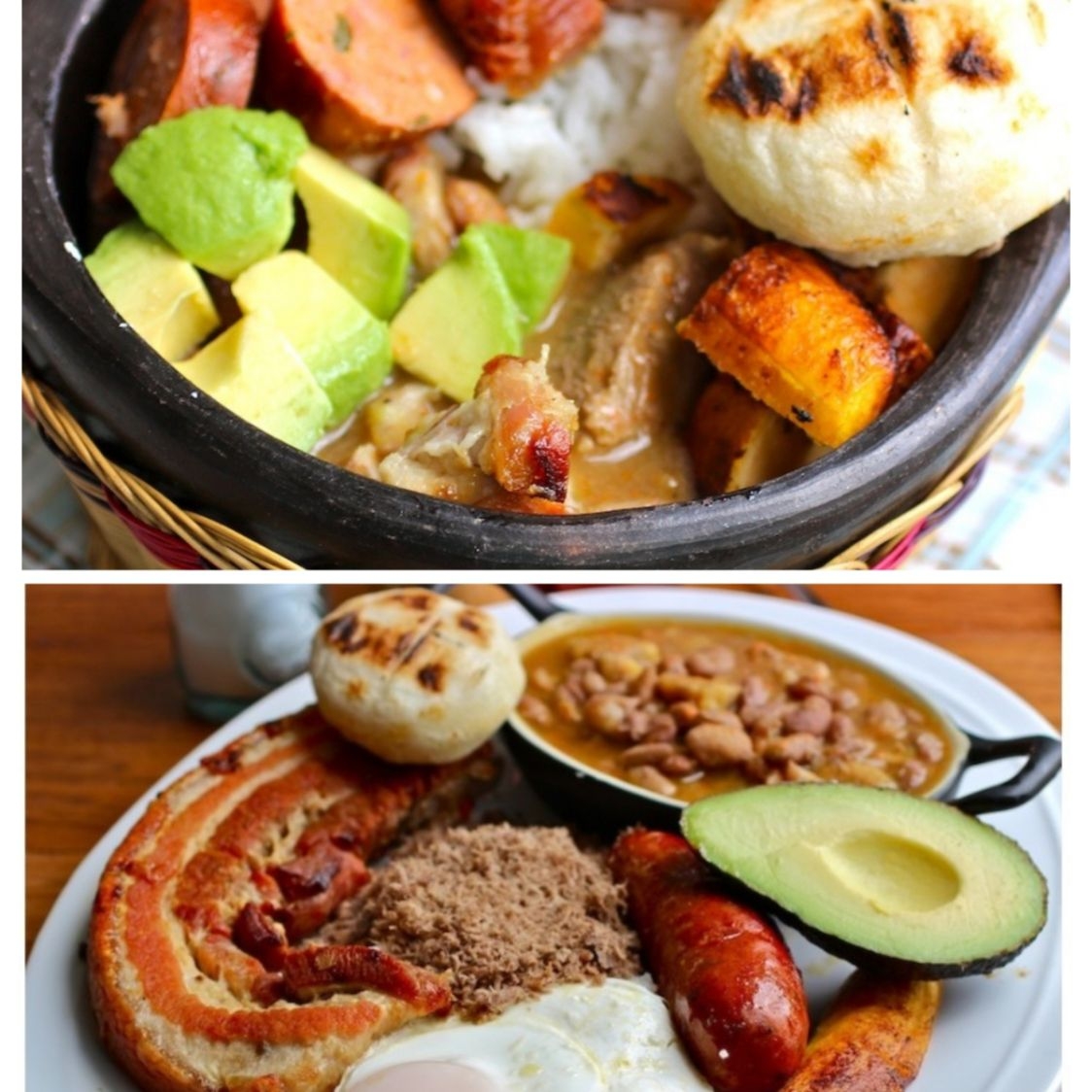 Frijol chicharrón picado chorizo picado aguacate picado platano maduro picado ripio de papa arepa arroz y bebida