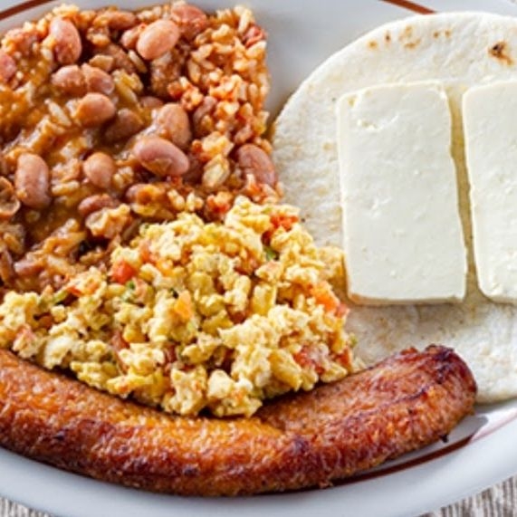 Arroz blanco, ensalada del día, frijoles, huevo frito, tajada de maduro, arepa, 100 g de proteína a elección, sopa (8 oz) y bebida (9 oz).