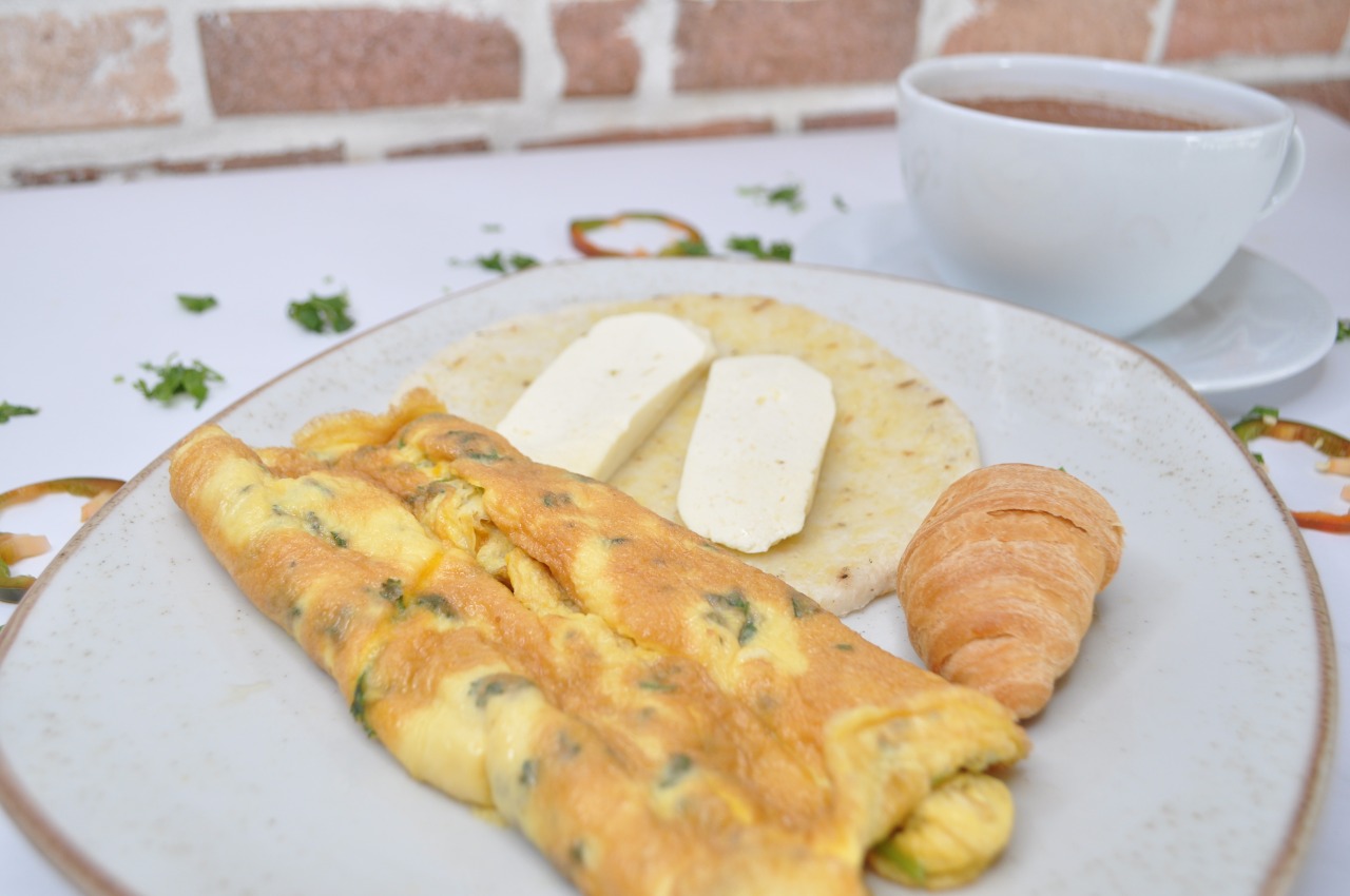 Huevos revueltos (con aliños o sin aliños), queso cuajada, arepa, pan y bebida a elección.