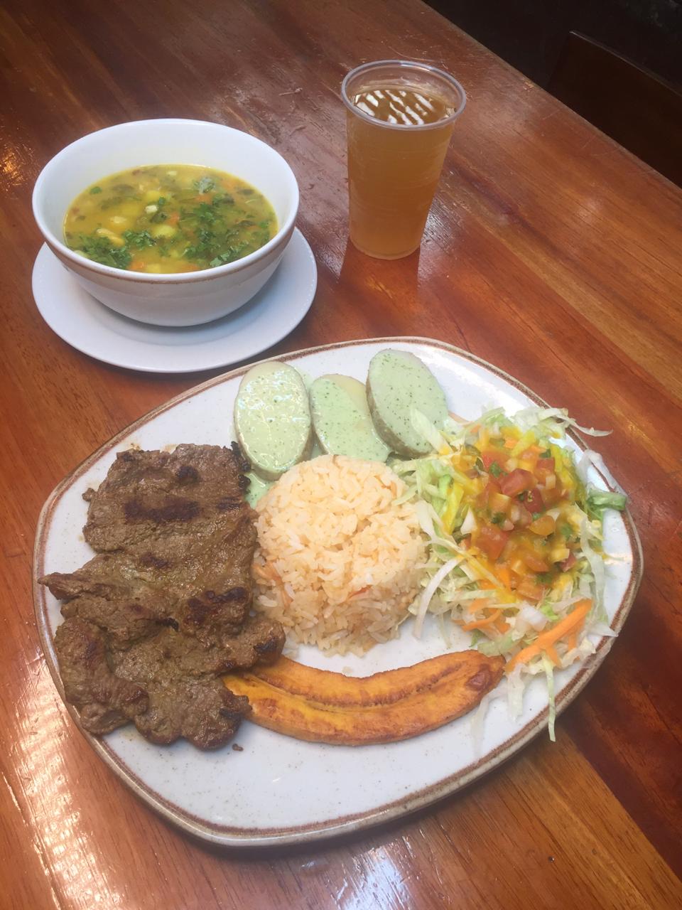 Platillo personal ,Sopa o crema del día o frijol, carne, acompañados de arroz, ensalada, tajadas de plátano, papas y bebida del día.
