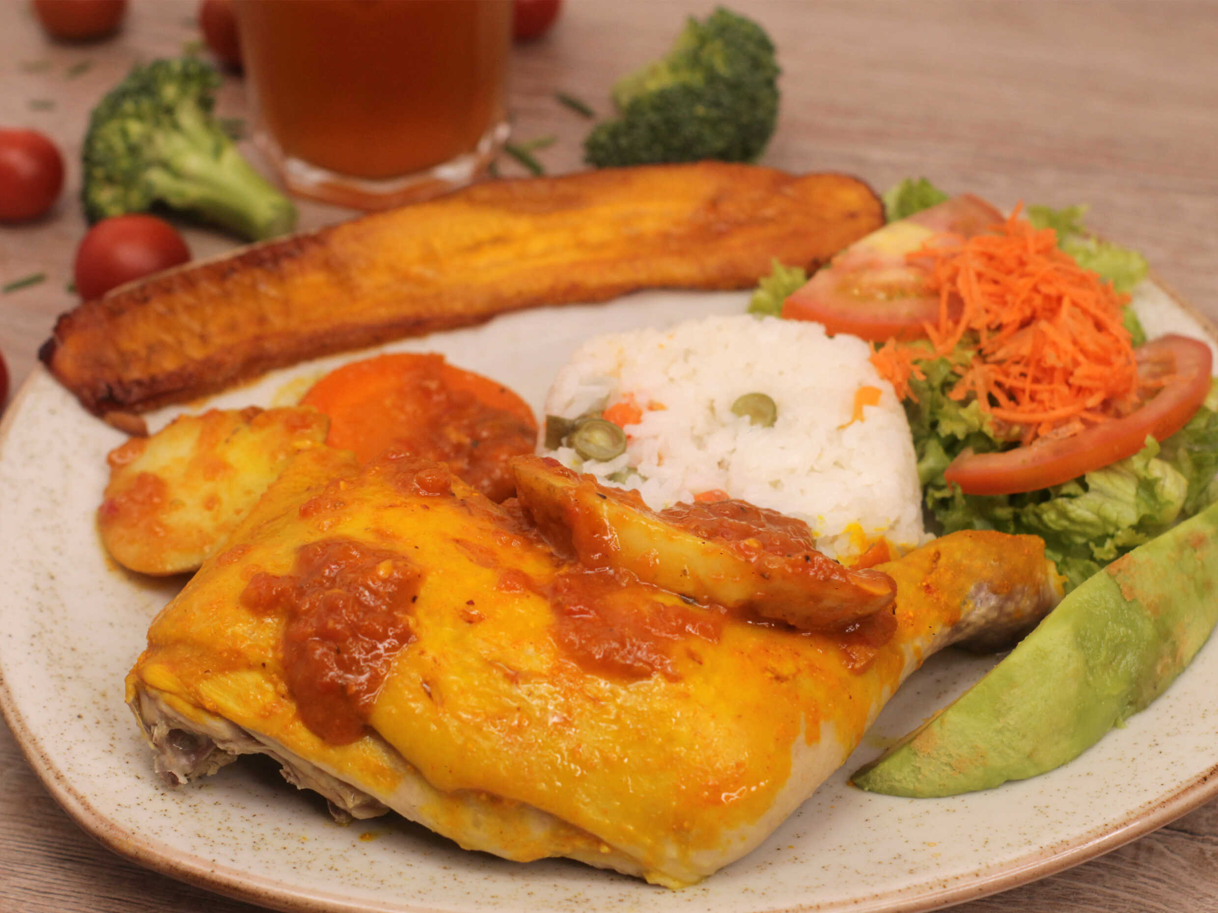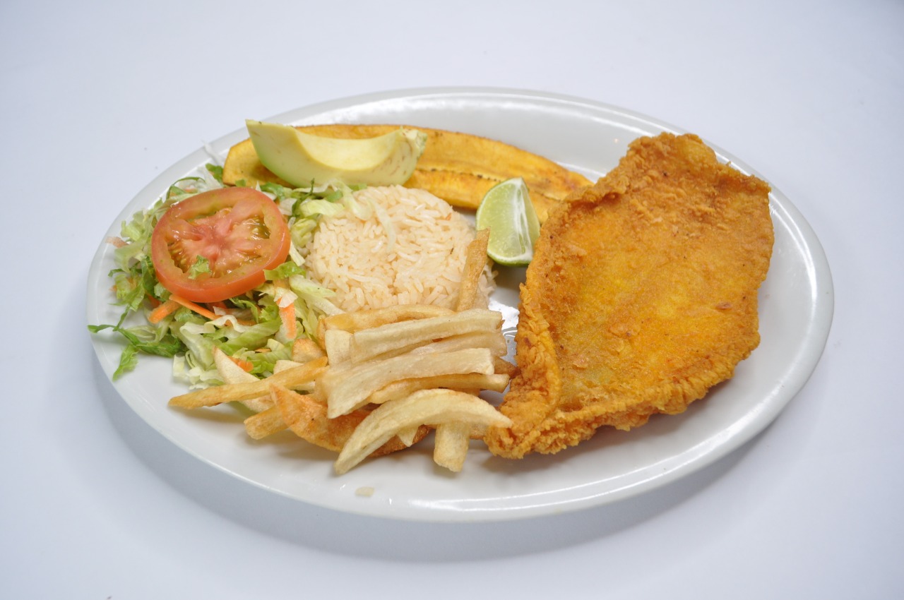 Acompañado de arroz, ensalada, tajada de plátano, aguacate, yuca sudada, sopa del día o crema del día jugo del día