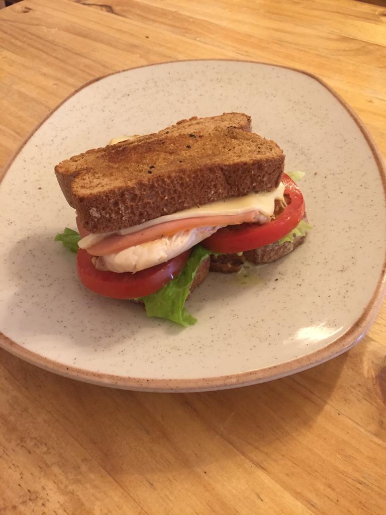 Pan integral, pollo apanado, tomate, lechuga, jamón, queso y deliciosa salsa de la casa.