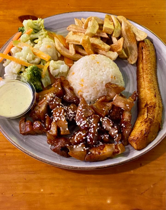 Chicharron en syrup, Arroz, papas a la francesa , ensalada maduro sopa del día o crema y jugo del día