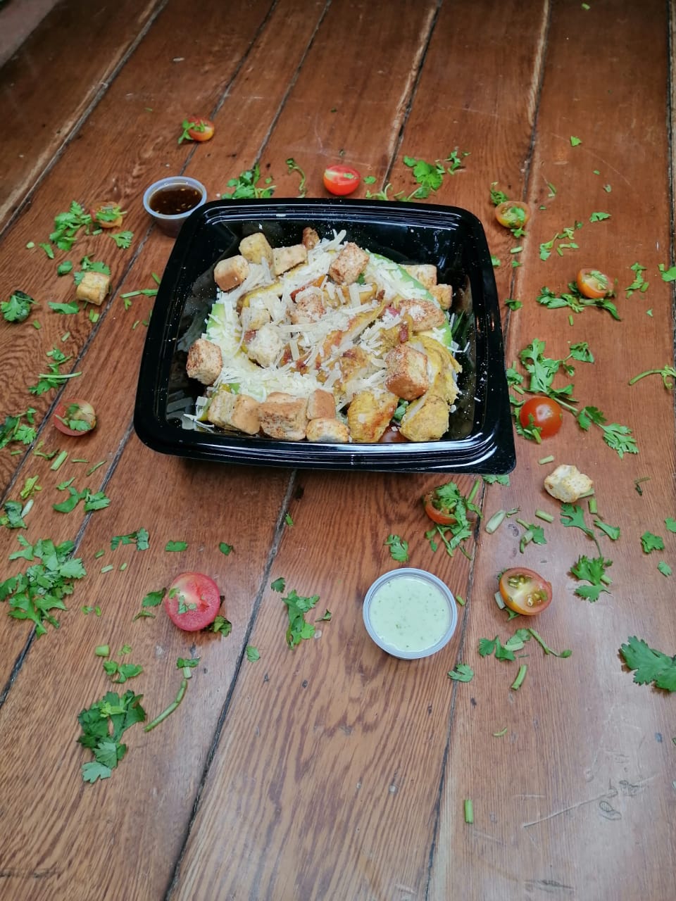 Tres tipo de lechuga con tomate cherry crotones pechuga en julianas vinagreta de la casa y queso parmesano con sopa del día o crema y jugo del día