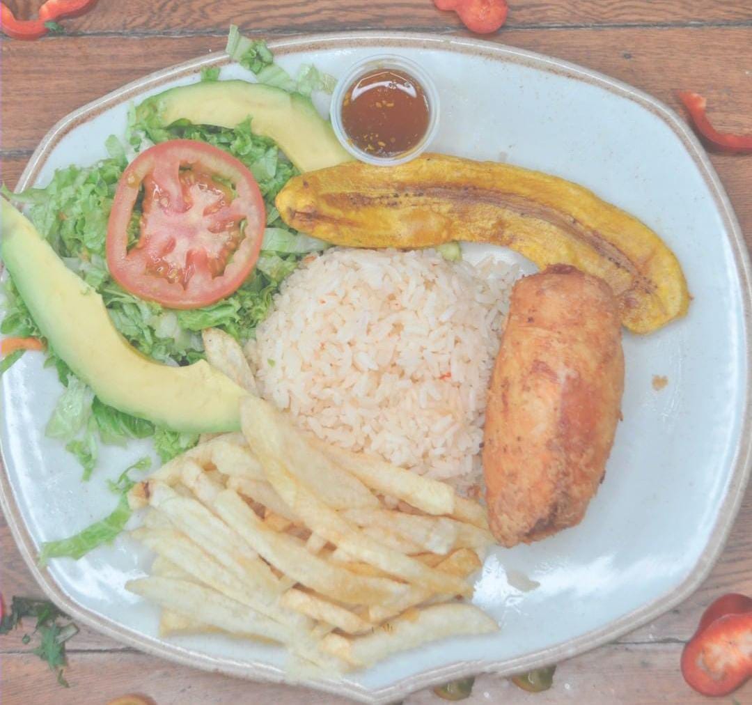 Pollo relleno de jamón queso y tocineta apanado y frito, Arroz, papas a la francesa, aguacate , ensalada, maduro, sopa del día o crema y jugo del día