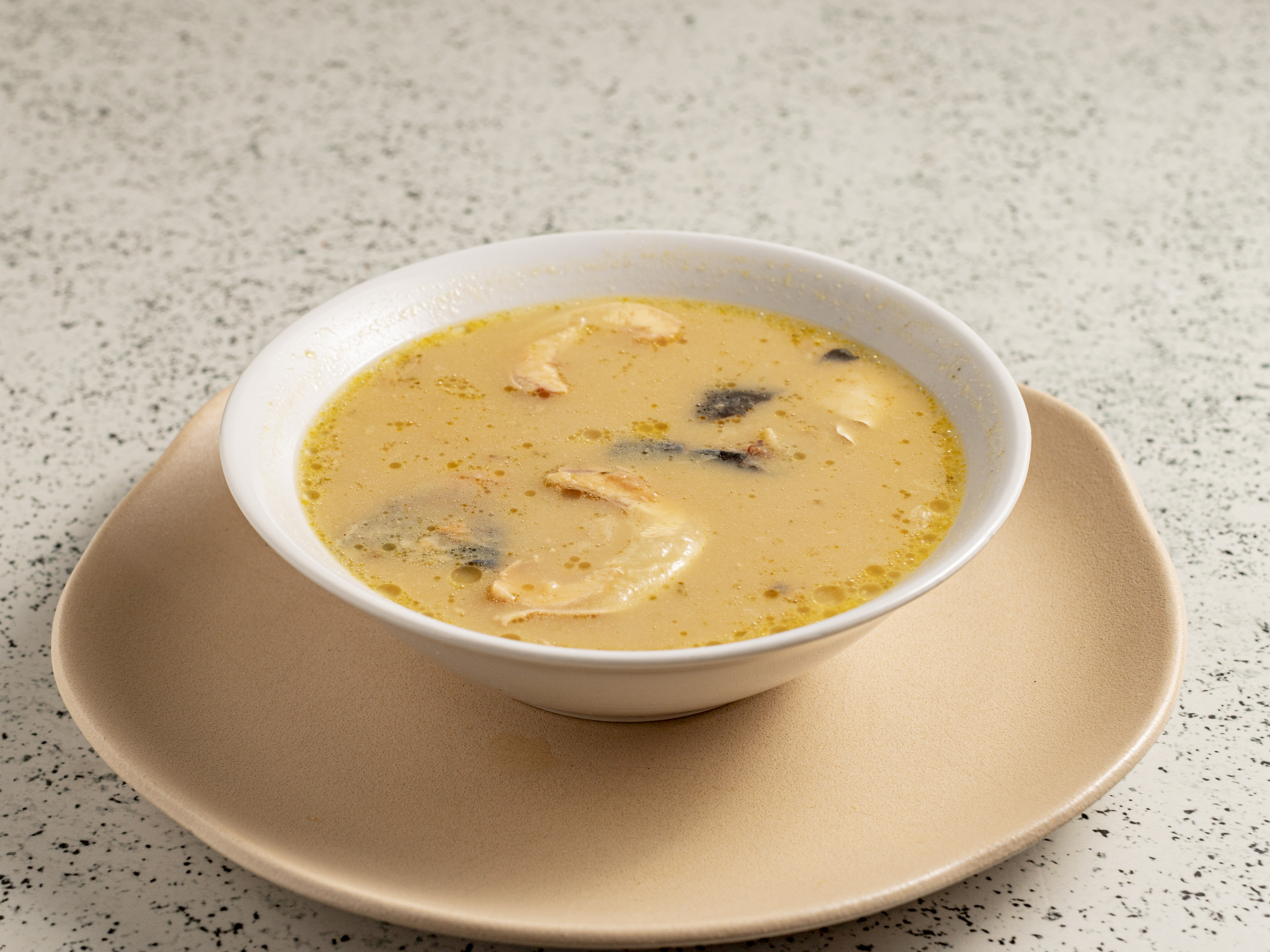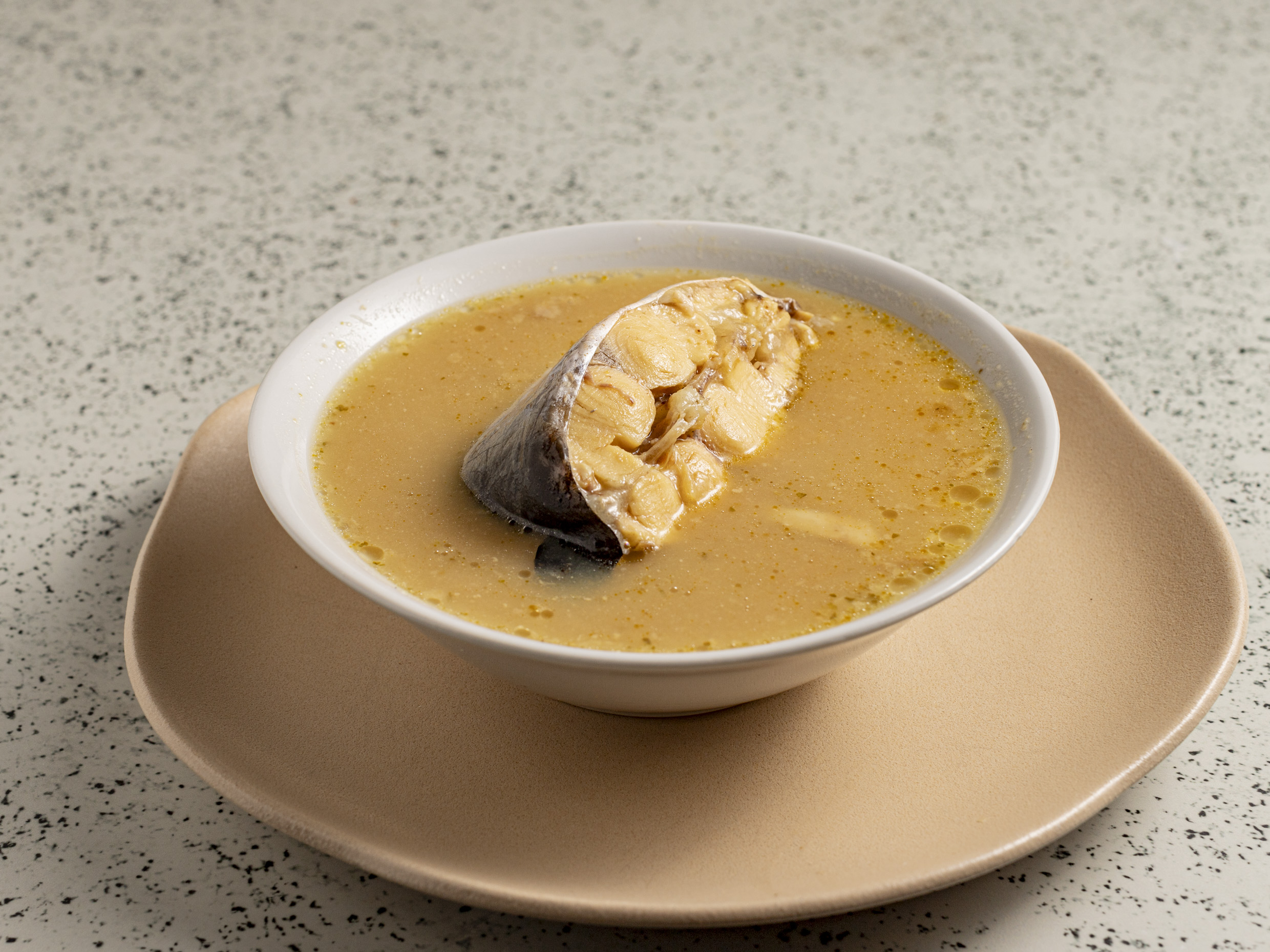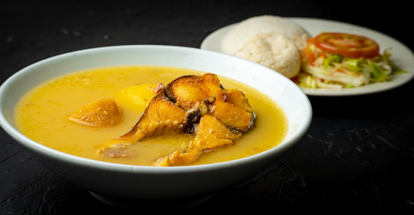 Bandeja con rodaja de pescado sudado, acompañada de sopa de pescado, arroz blanco, ensalada (tomate, lechuga), papa y yuca cocinada y bebida (limonada natural).