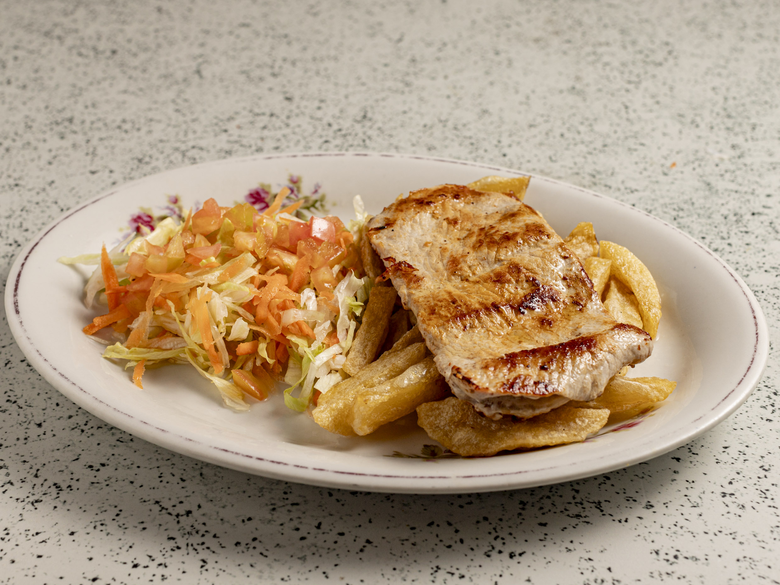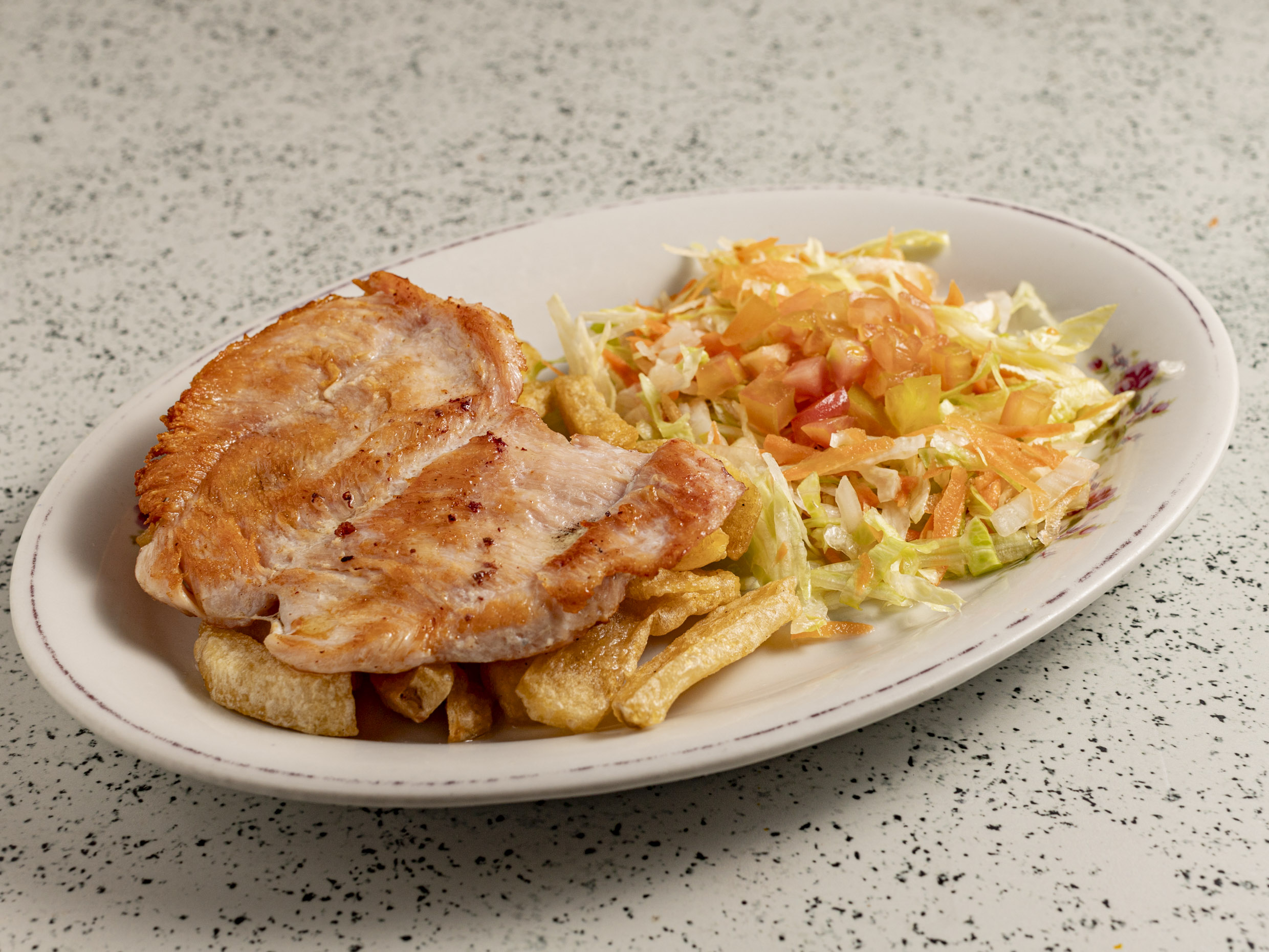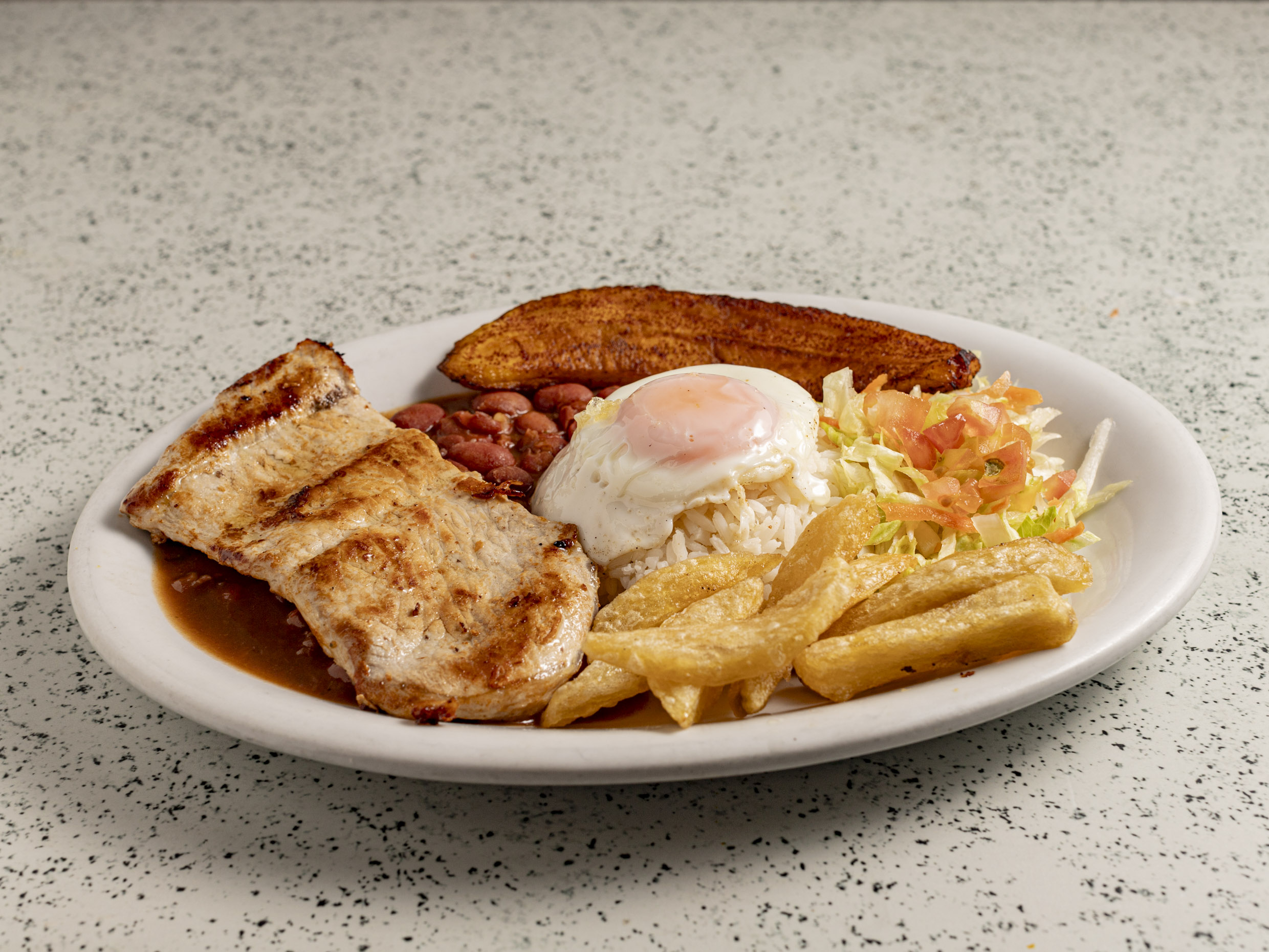 Carne de cerdo a la plancha, acompañada de papitas fritas, ensalada (tomate, lechuga), arepa y sobremesa.