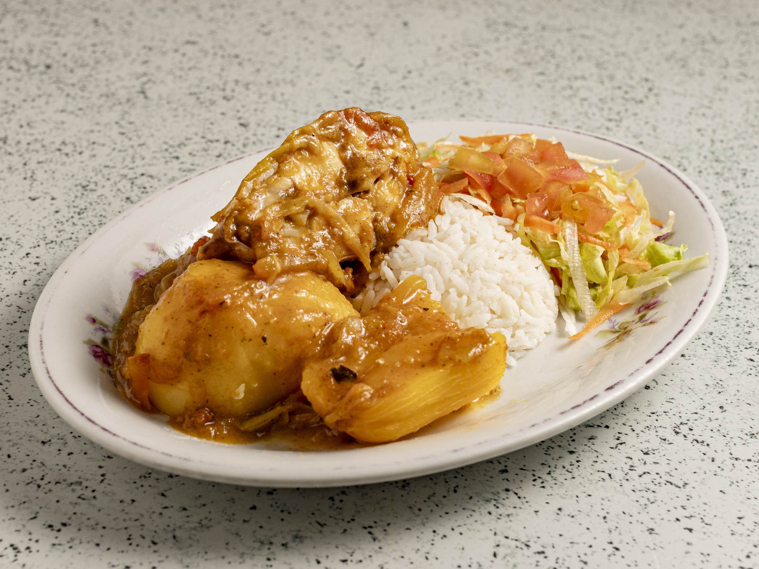 Bandeja con posta, arroz blanco, ensalada (tomate, cebolla, lechuga), papa y yuca cocinada sopa de frijol y bebida (limonada natural).