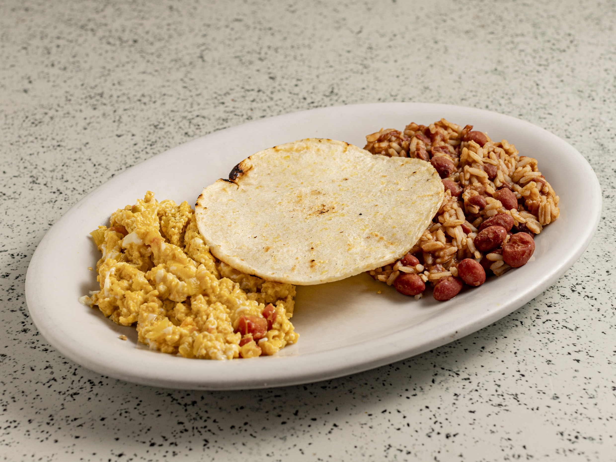 Calentado con pechuga de pollo, huevo, arepa, quesito y bebida.