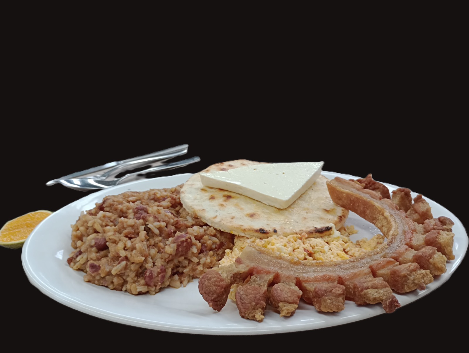 Calentado con chicharrón carnudo, huevo, arepa, quesito y bebida
